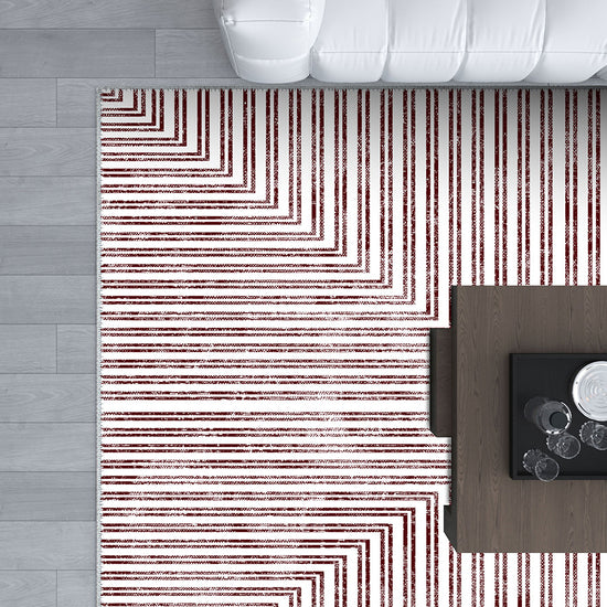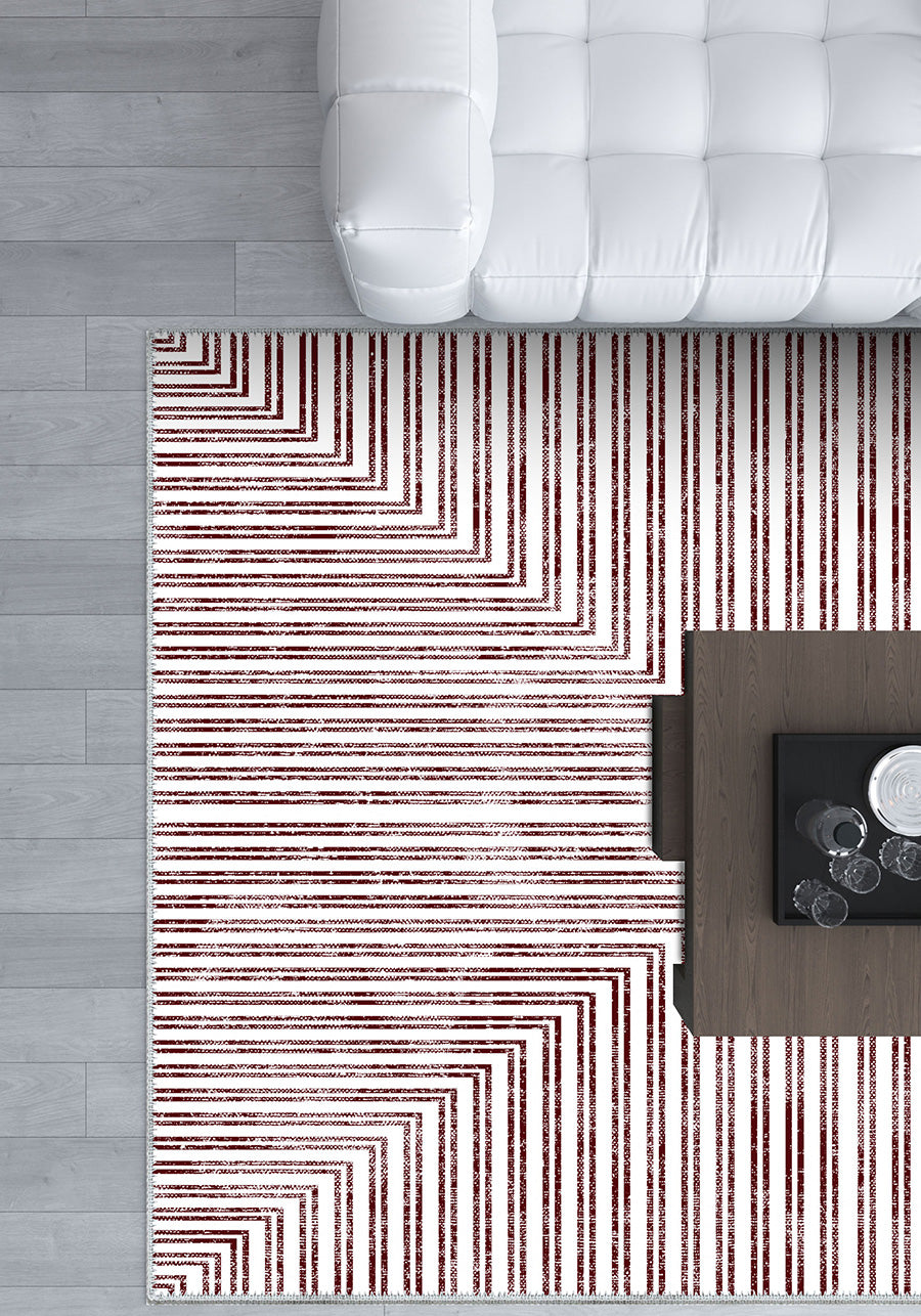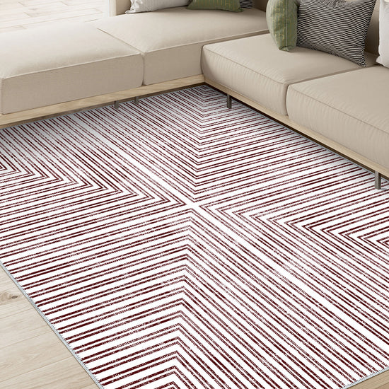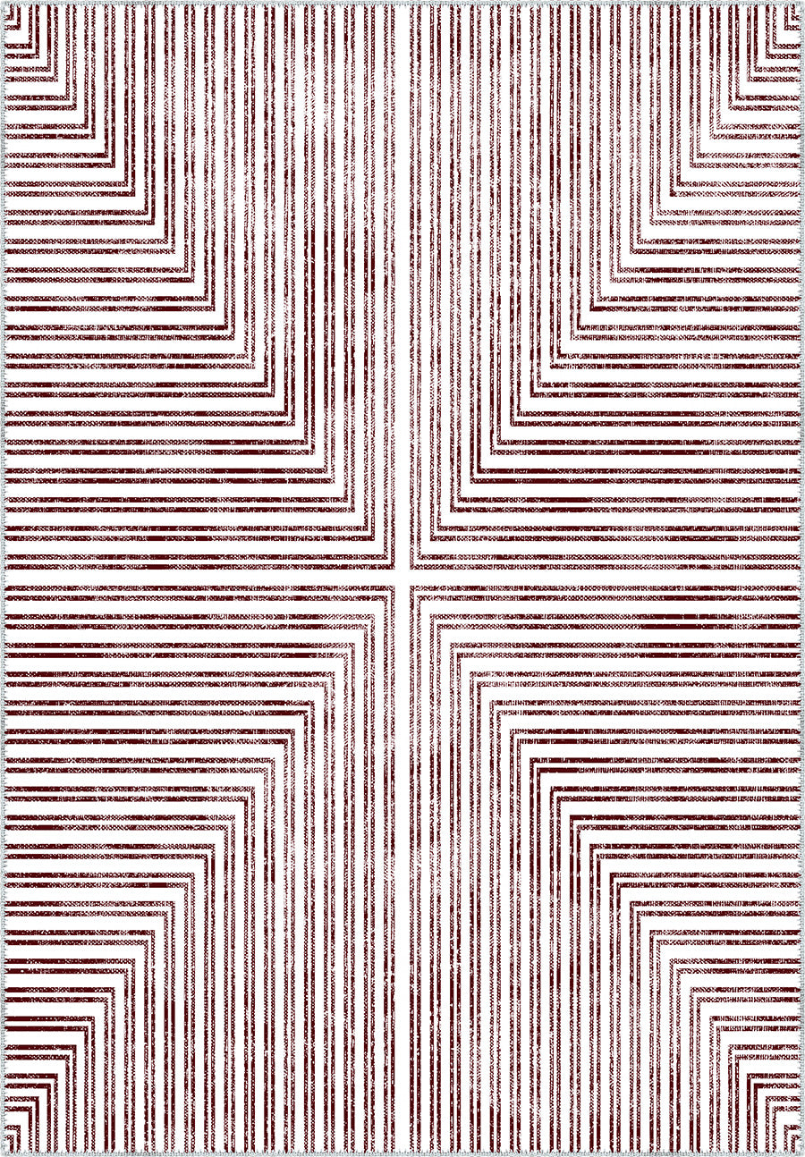 Elevate your space with the striking simplicity of the Kylie Geometric Washable Rug. Its bold, symmetrical geometric pattern in rich burgundy and white brings contemporary elegance to any room, making it a statement piece that draws attention while maintaining a clean, sophisticated aesthetic.
