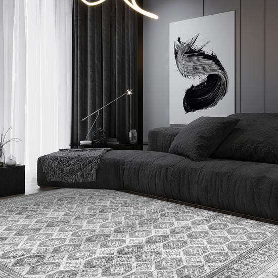 The Larona Grey Distressed Rug combines vintage charm with contemporary versatility, making it the perfect foundation for any modern or classic space. Its intricate lattice pattern, framed by a delicate border, is softened by a beautifully distressed finish, giving it an effortlessly stylish, timeworn appeal.