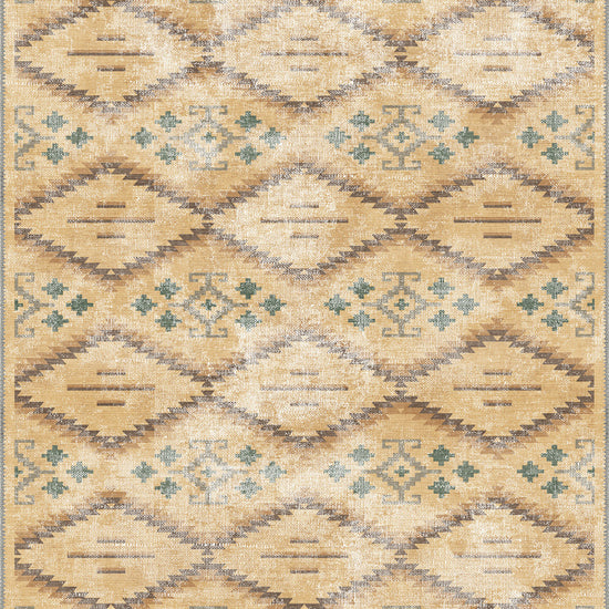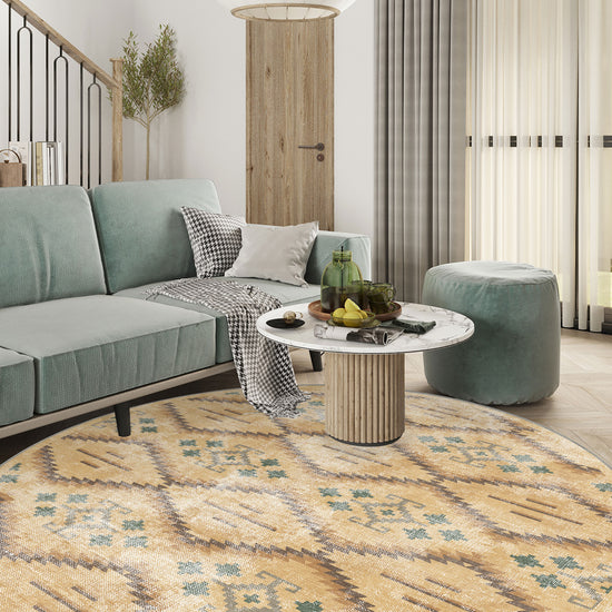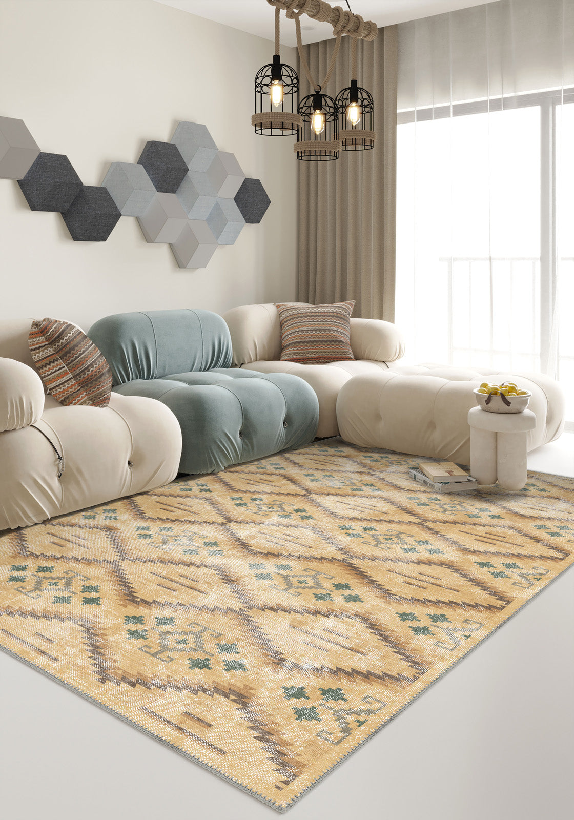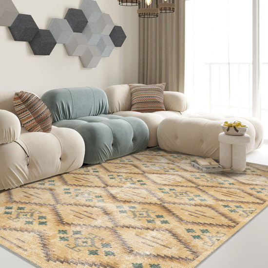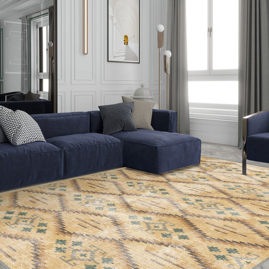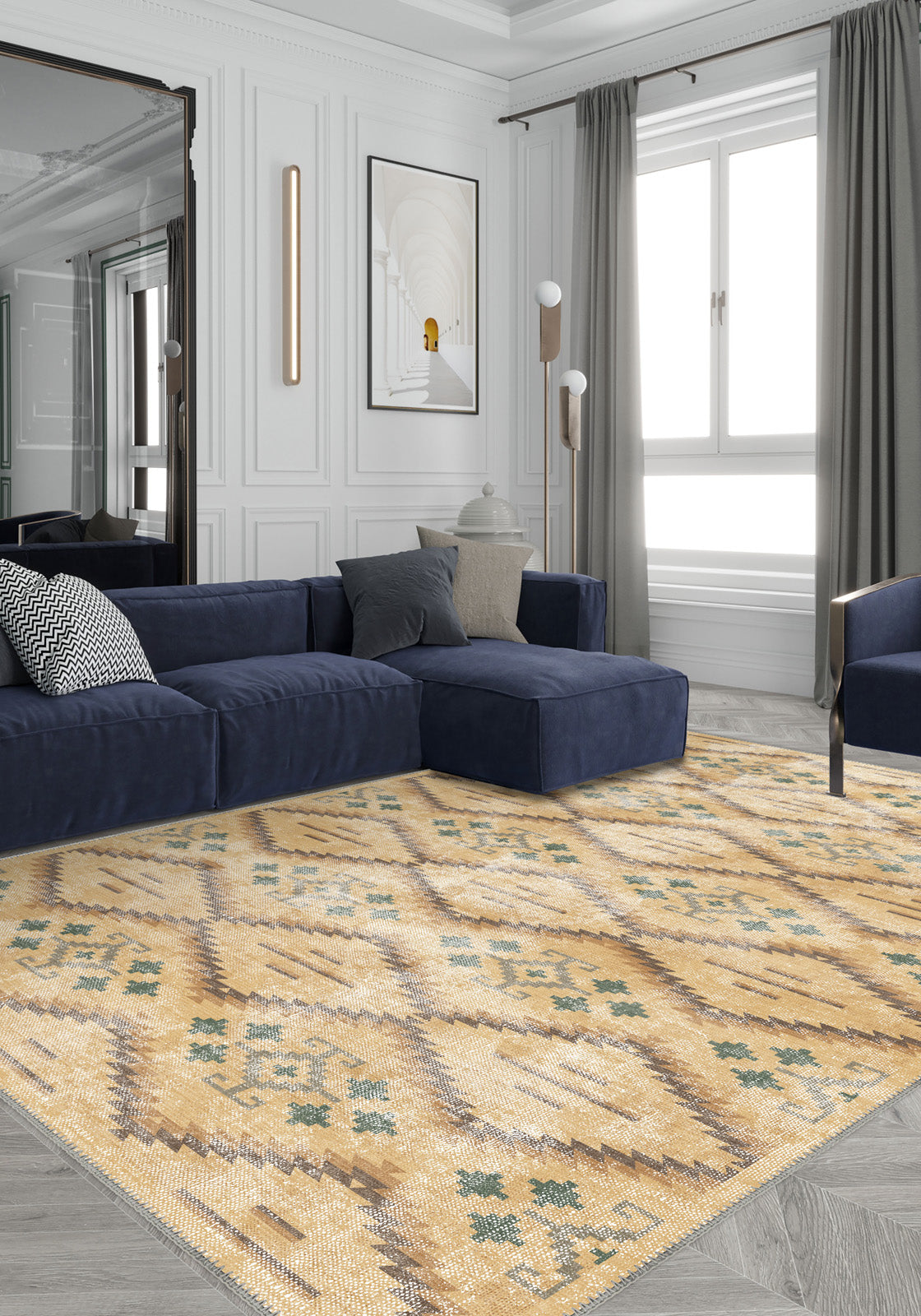 The Leo Yellow Distressed Rug features a dynamic geometric design in warm yellow tones, accented with subtle green and beige patterns. Its distressed finish adds a rustic charm, making it perfect for both contemporary and bohemian interiors. This versatile rug brings a cozy yet stylish feel to any space.