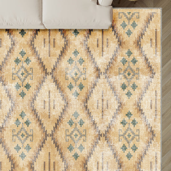 The Leo Yellow Distressed Rug features a dynamic geometric design in warm yellow tones, accented with subtle green and beige patterns. Its distressed finish adds a rustic charm, making it perfect for both contemporary and bohemian interiors. This versatile rug brings a cozy yet stylish feel to any space.