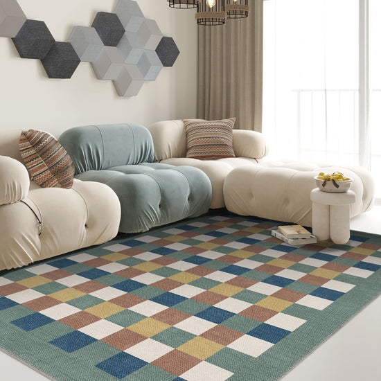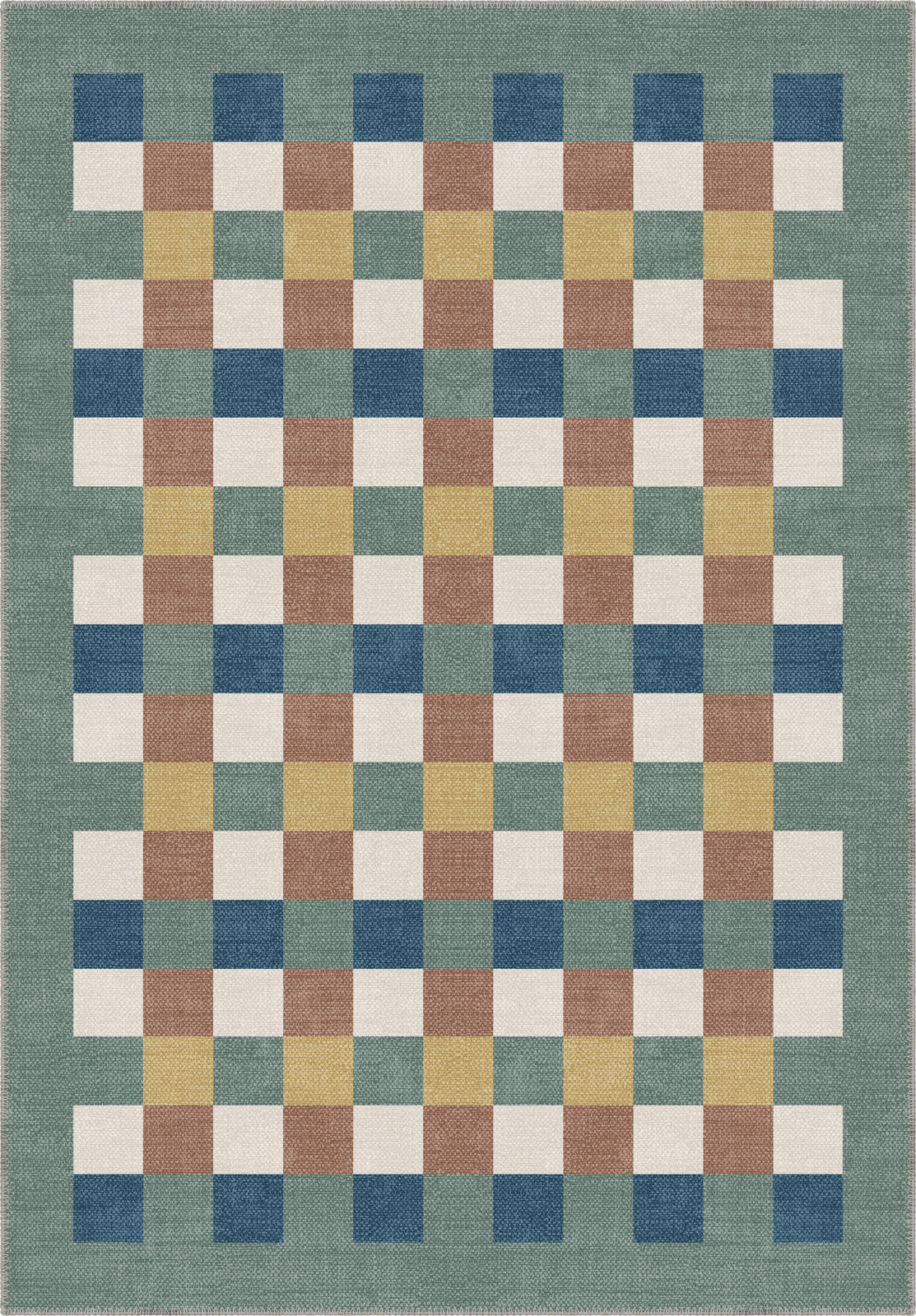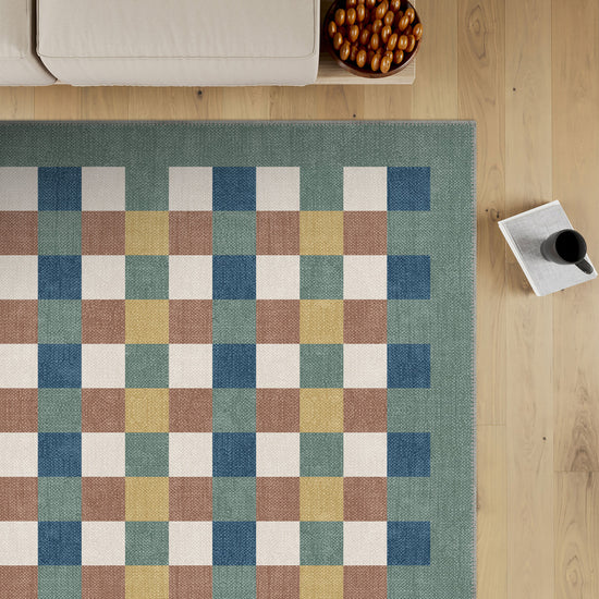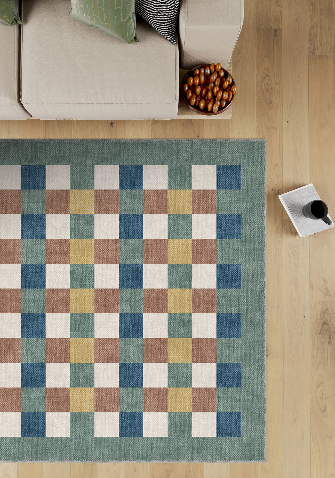 Infuse life into your home with the vibrant charm of the Liam Geometric Washable Rug. Featuring a striking checkered pattern in earthy greens, bold blues, mustard yellows, and rich browns, this rug blends timeless design with a splash of contemporary flair. Perfect for brightening up any room, it’s a versatile statement piece.