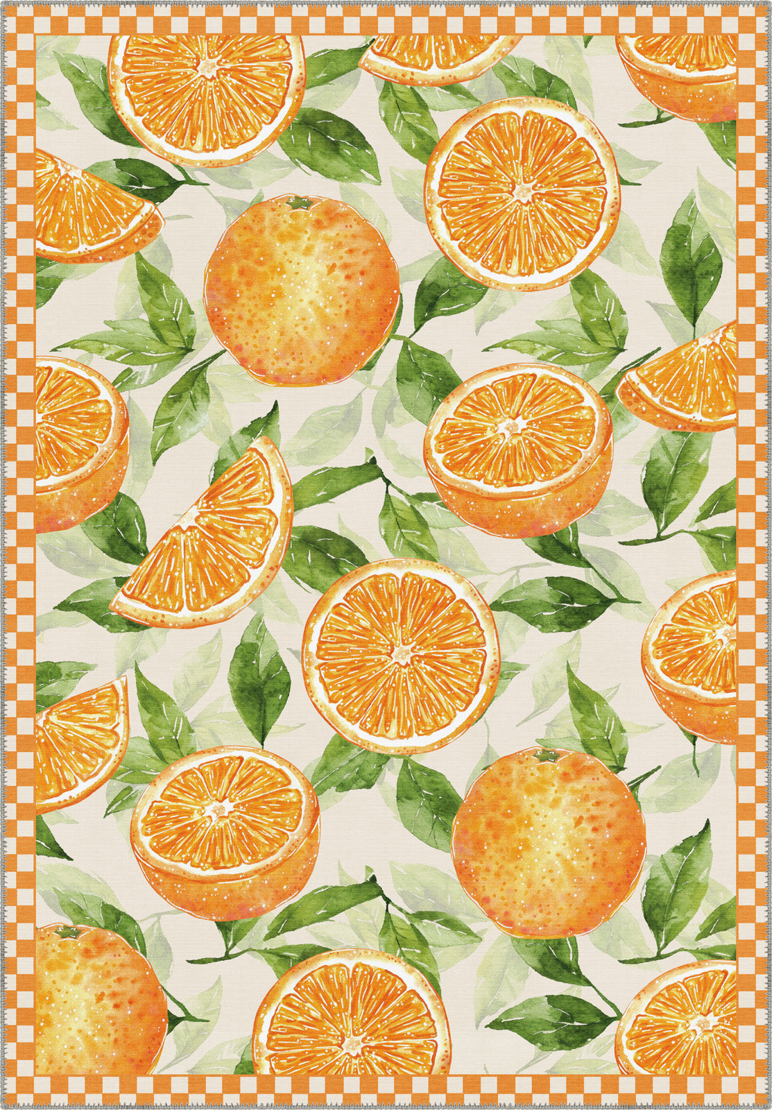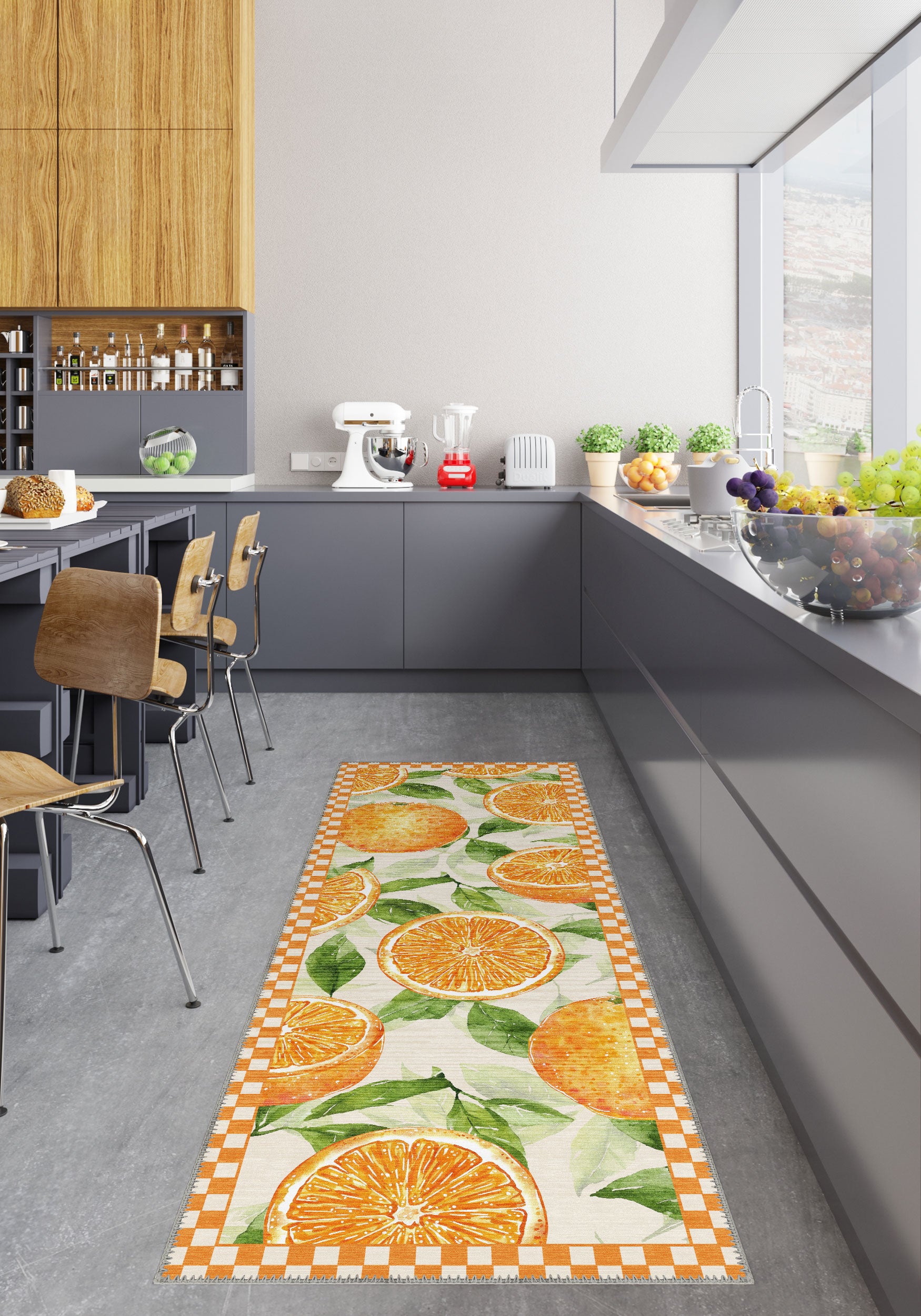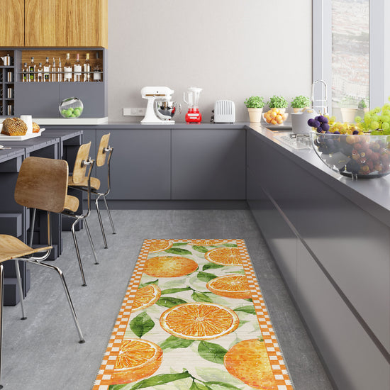 The Livia Orange Washable Kitchen Rug brings a burst of vibrant, zesty style to your kitchen with its fresh citrus design. Perfect for adding a lively touch to your kitchen, this rug combines practicality with a playful aesthetic that will brighten up any culinary space.