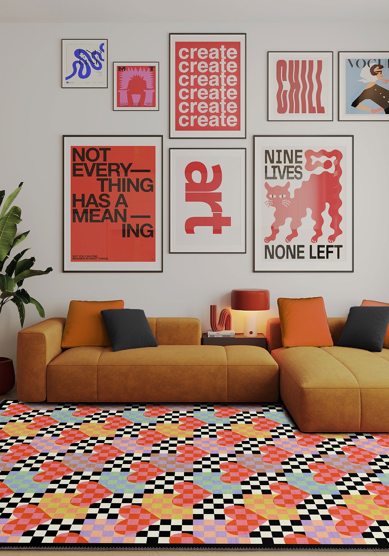 If Wes Anderson had a rug phase, this would be it. The Lolly Checkered Heart Rug is an unapologetic celebration of joy, geometry, and pure affection. With red hearts nestled in a hypnotic black-and-white checkered background, interspersed with soft pastel blocks, this rug is a declaration of love—for your space and your style.
