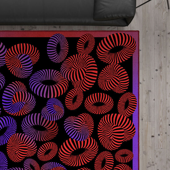 Step into another dimension—literally. The Lorelai Colourful 3D Rug features hypnotic spirals in deep violet and fiery red, floating over an inky black backdrop. This rug doesn’t whisper; it sings. With its pulsating geometry and dramatic contrast, it's a dream come true for anyone drawn to bold, expressive design. An instant icon for modern, maximalist, or creative interiors.