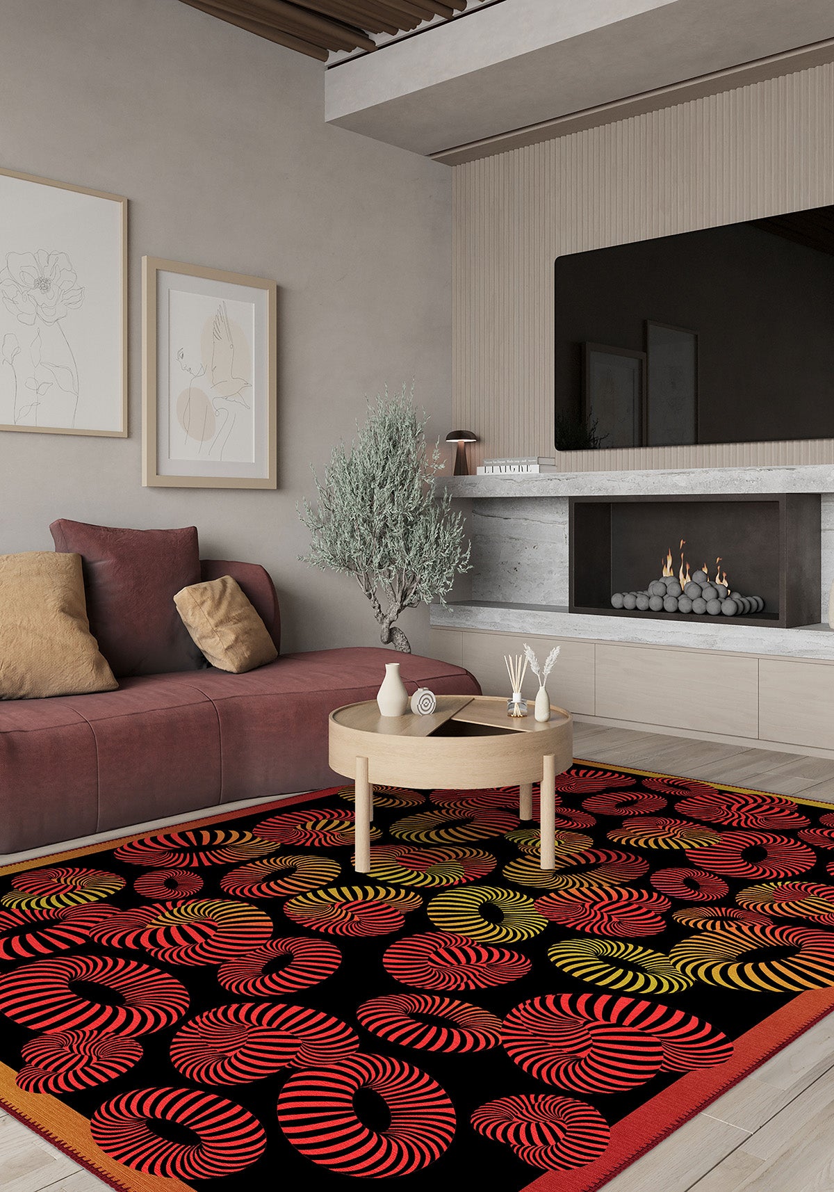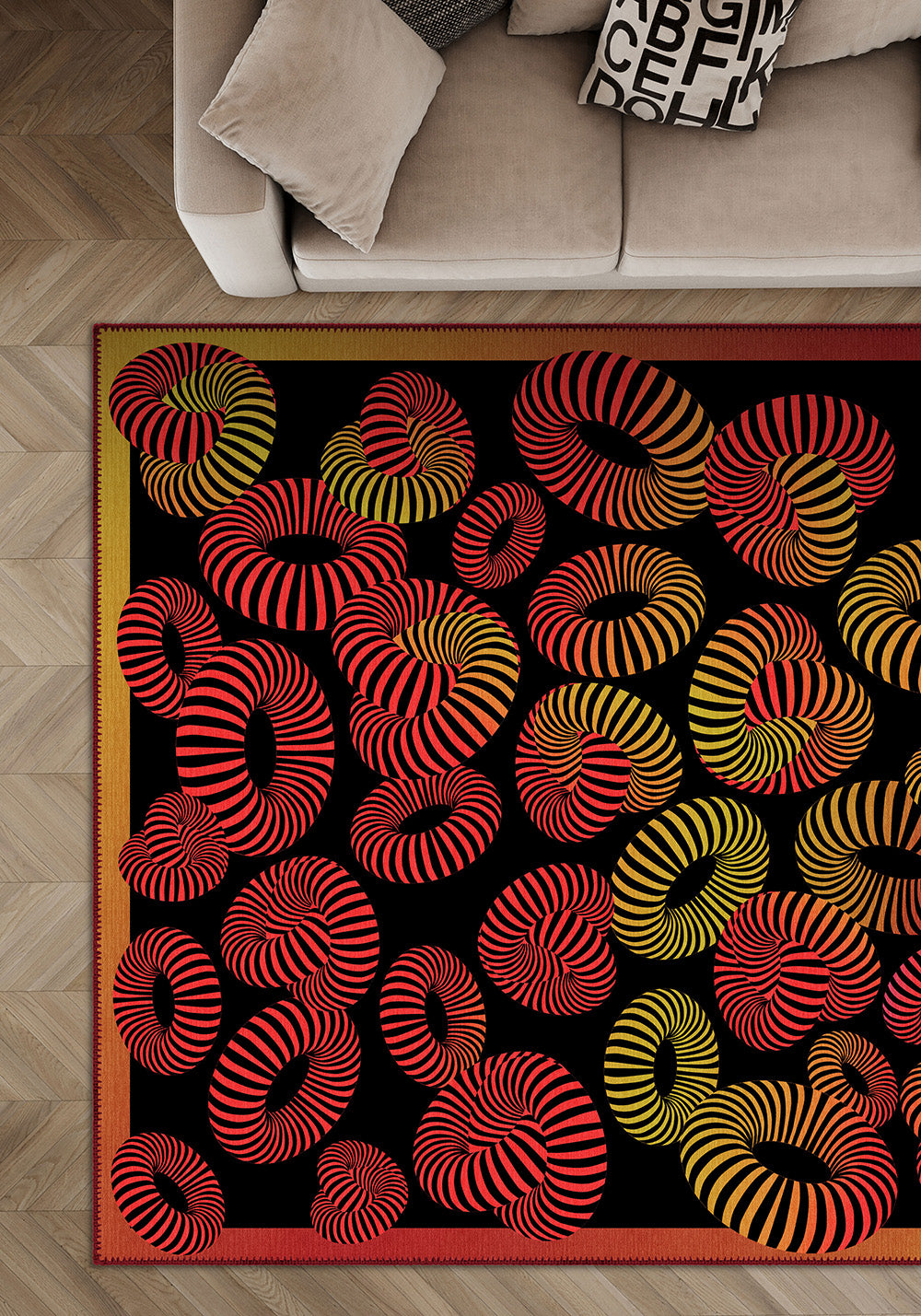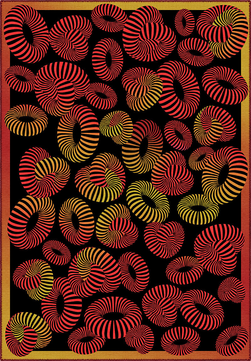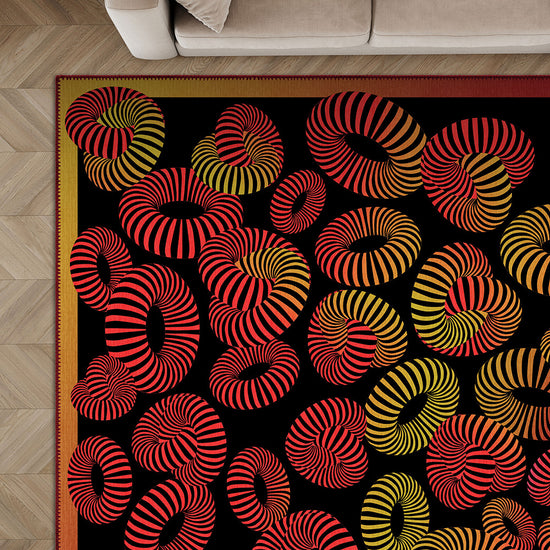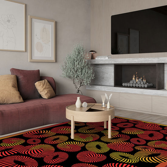 The Lorelai Colourful Geometric Rug isn’t for the faint of heart—it’s for the ones who love drama, movement, and unapologetic design. With swirling 3D stripes in fiery red, golden ochre, and electric orange set against deep black, this rug feels like a visual dance floor. It’s modern, bold, and full of life—designed to spark joy in every corner it touches.
