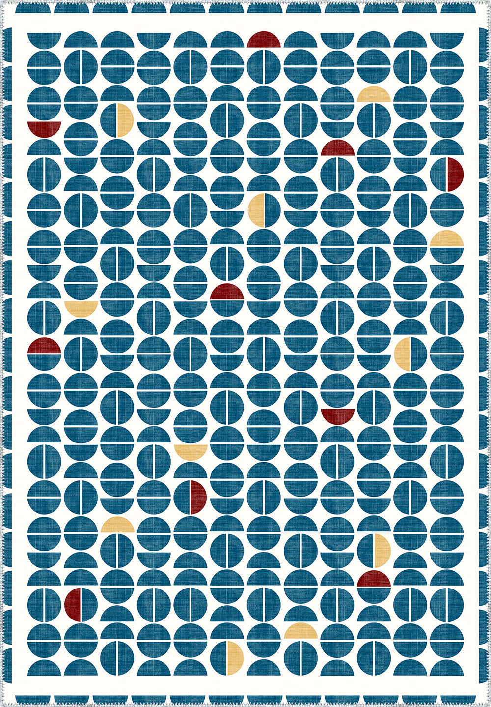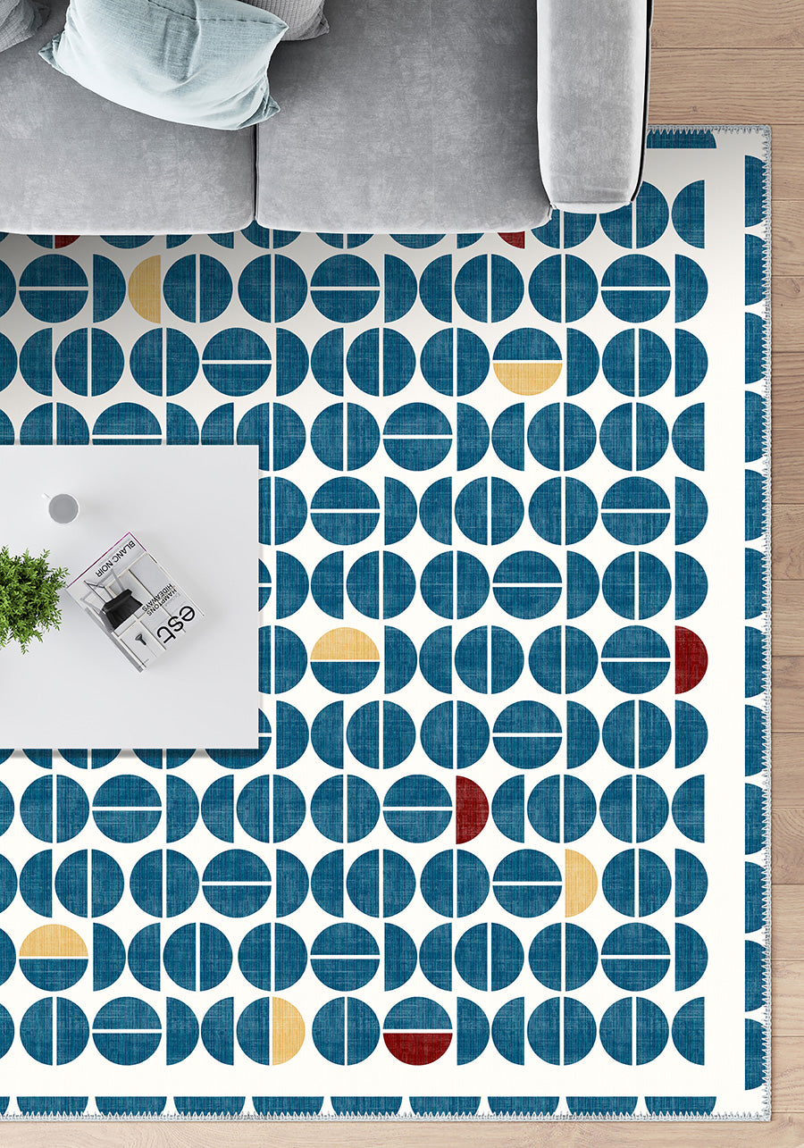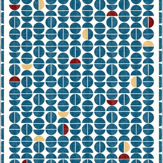 - Striking geometric pattern with vibrant blue, red, and mustard hues