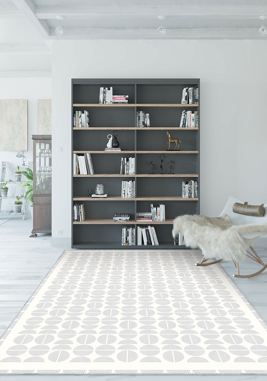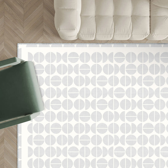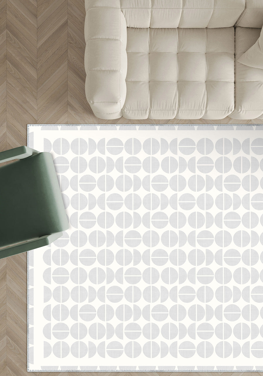 The Lucas Grey Modern Rug showcases a minimalist geometric design with subtle grey half-circle patterns on a soft white background. Its neutral palette and modern style make it an elegant addition to contemporary spaces, adding a touch of sophistication while maintaining a clean, airy feel.