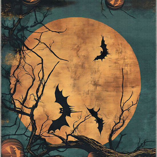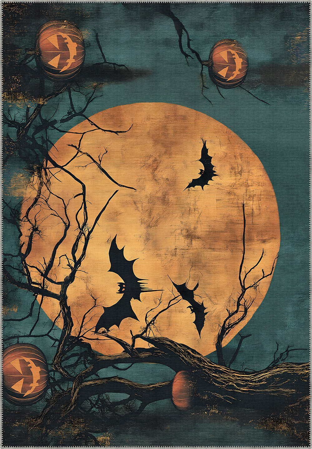 - Spooky Halloween Scene: The centerpiece of this rug is a vibrant orange moon with silhouettes of flying bats and gnarled tree branches, capturing the essence of Halloween night.