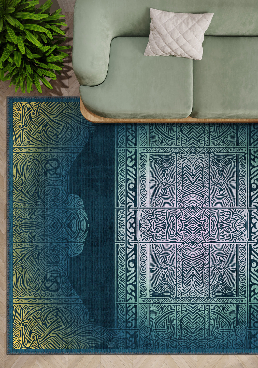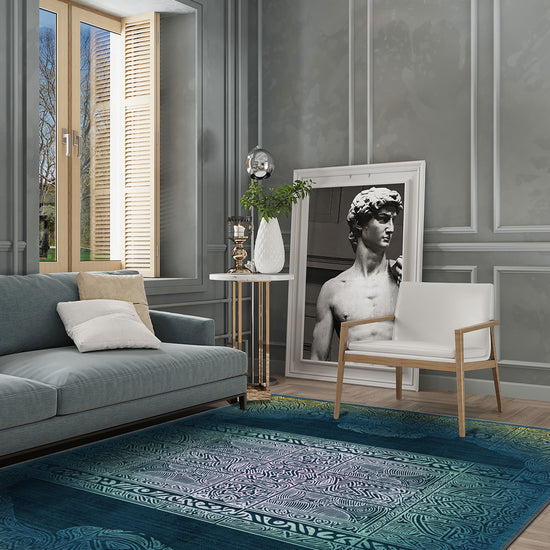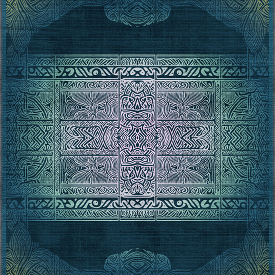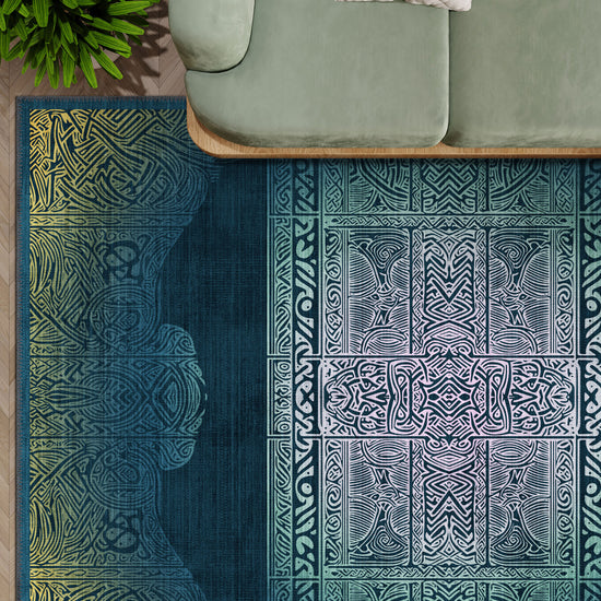 Infused with mythic elegance, the Maeva Teal Celtic Rug invites you into a world where ancient Celtic geometry meets modern fluidity. A labyrinth of interwoven knots and mirrored symmetry stretches across a soothing gradient of teal, emerald, and seafoam, grounded by deep navy shadows that frame the piece like a portal.