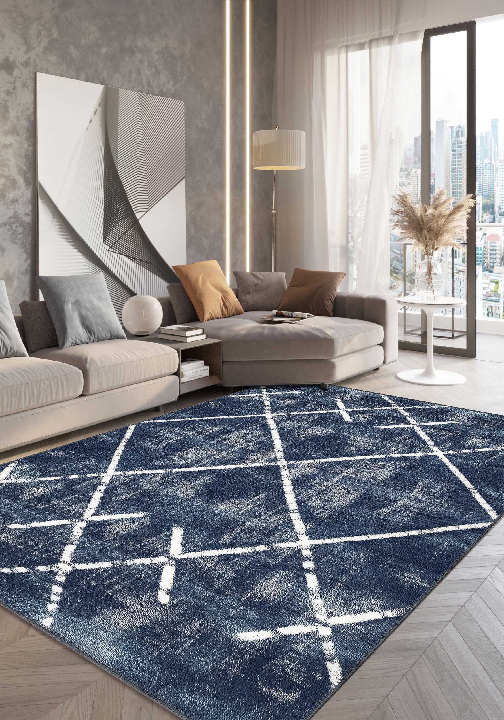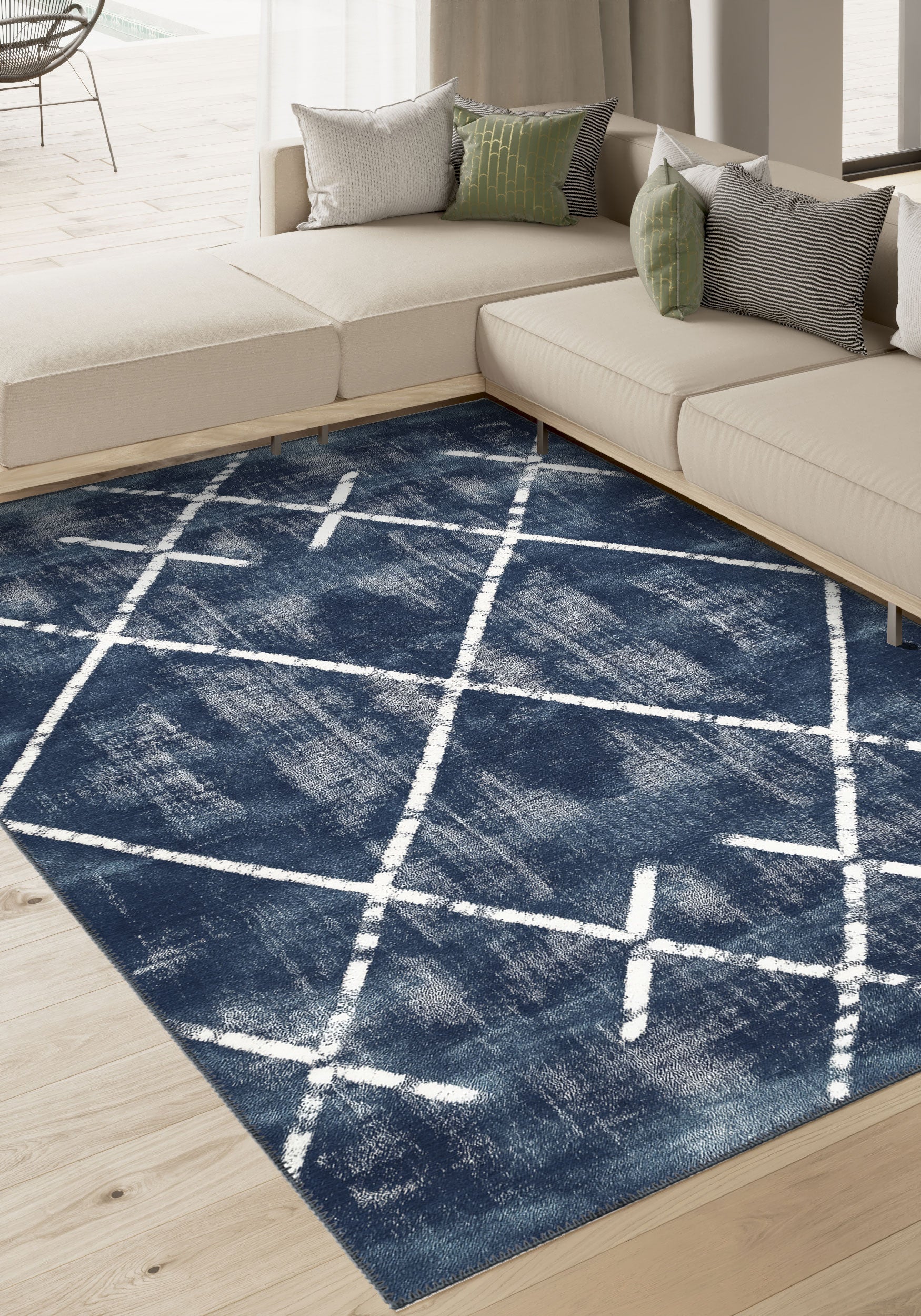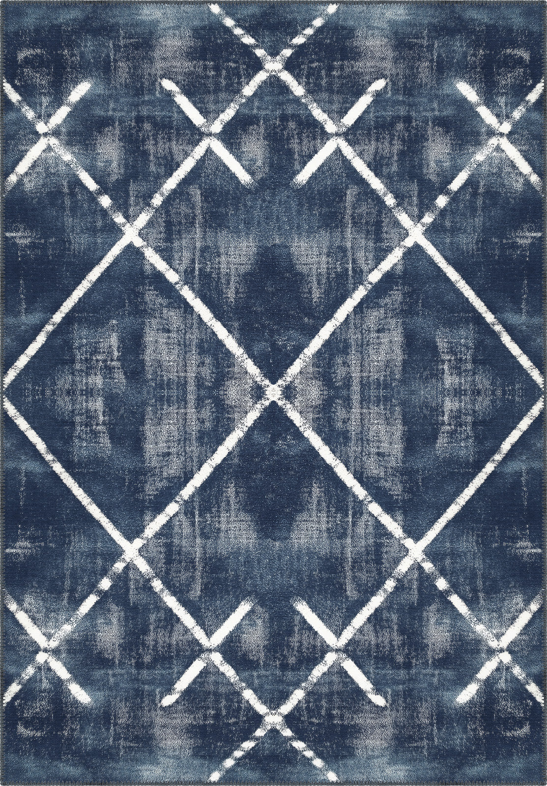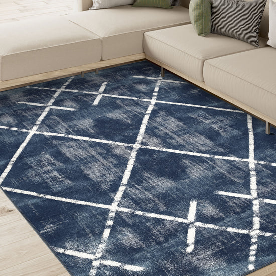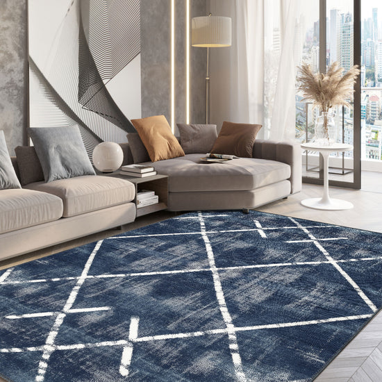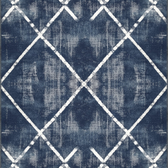 The Margot Washable Blue Rug brings a dramatic and modern aesthetic to any room with its bold, crisscross geometric design over a deep blue background. Perfect for creating a focal point, this rug combines a modern yet timeless pattern with the added convenience of being machine washable, making it both stylish and practical for busy homes.
