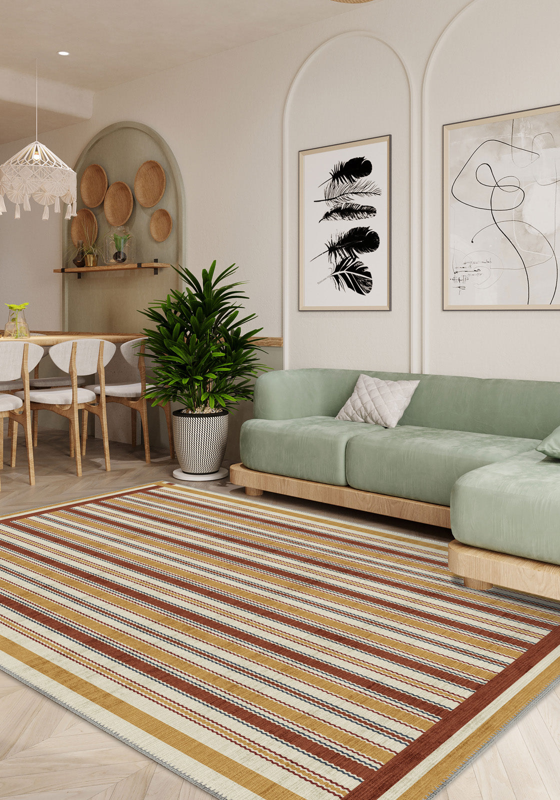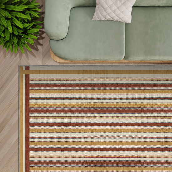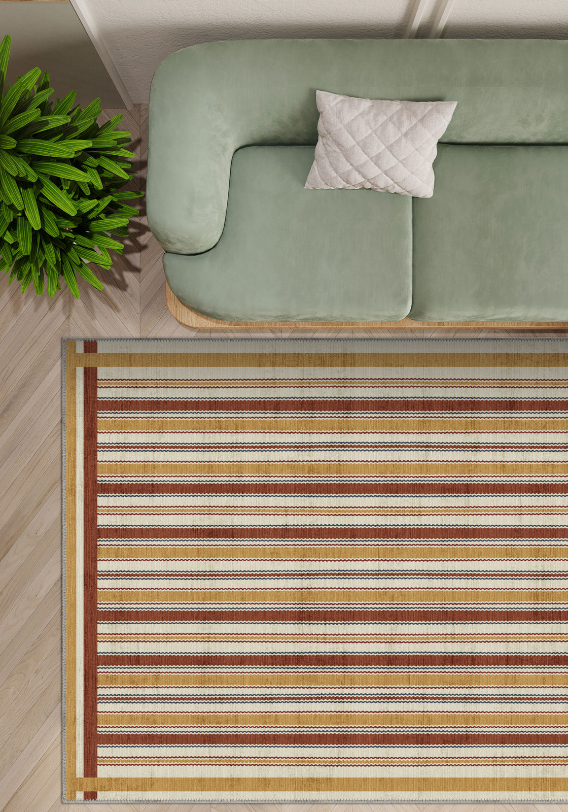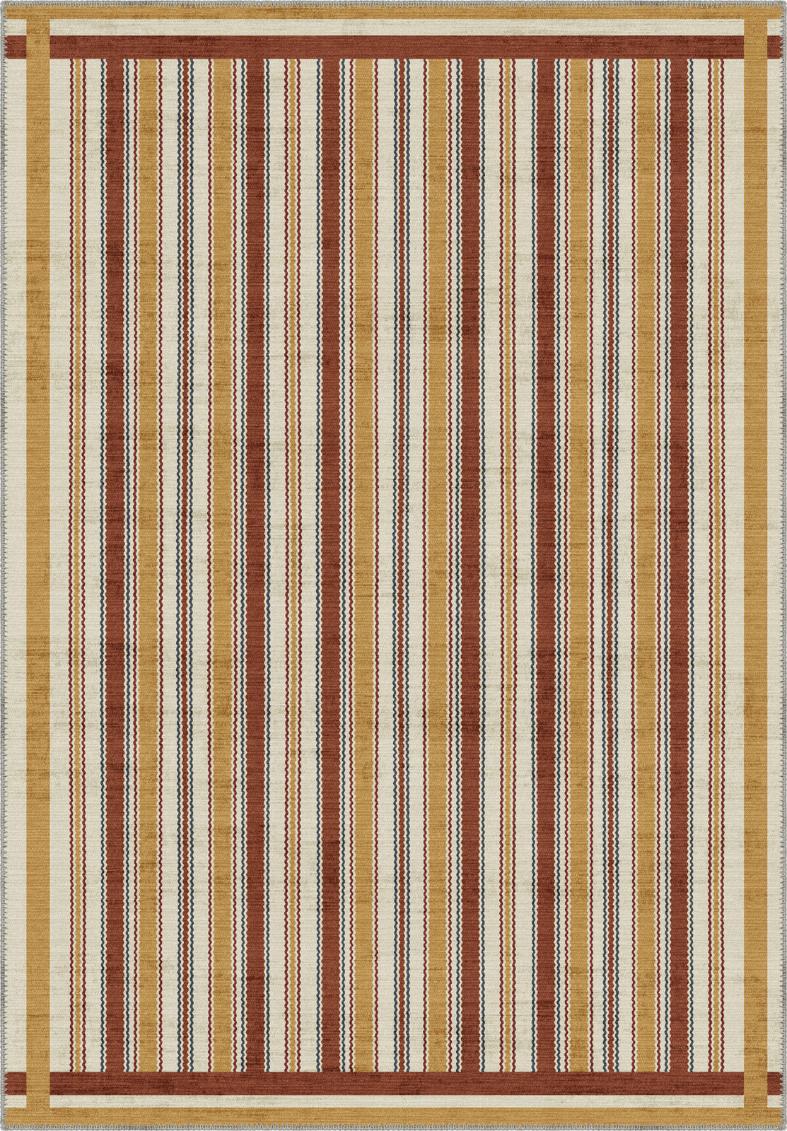 The Maris Colourful Bordered Rug boasts a striking striped pattern in rich tones of red, yellow, and beige, framed by a bold border for a timeless and vibrant appeal. Its warm palette enhances the coziness of any space, making it an ideal choice for adding a touch of charm and personality to your décor.