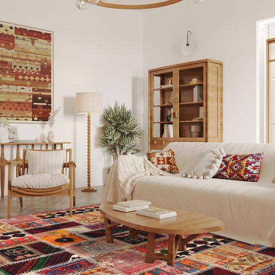 - Eclectic Patchwork Design: The Marius rug features a bold patchwork of geometric shapes and tribal-inspired motifs, creating an artistic, bohemian look.