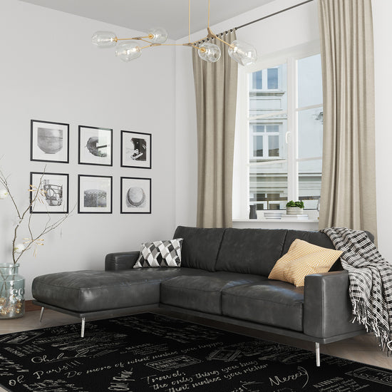 Whether laid in an eclectic office, a teen’s bedroom, or the hallway of a travel-savvy home, this rug becomes a conversation starter. Its monochrome palette gives it a timeless edge, while the graphics bring an artistic, personal feel that resonates with creatives, writers, and dreamers alike.