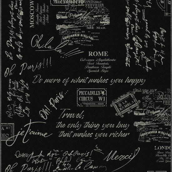 Evoking the spirit of postcards, old tickets, and love scribbled in the margins of time, the Memora Black Document Rug is more than a piece of decor—it’s a passport to romance. Set against a deep noir backdrop, vintage script and travel stamps whisper tales of Paris, Rome, Athens, and beyond, each letter dancing like memories from another lifetime. It’s poetic, mysterious, and oh-so-chic.