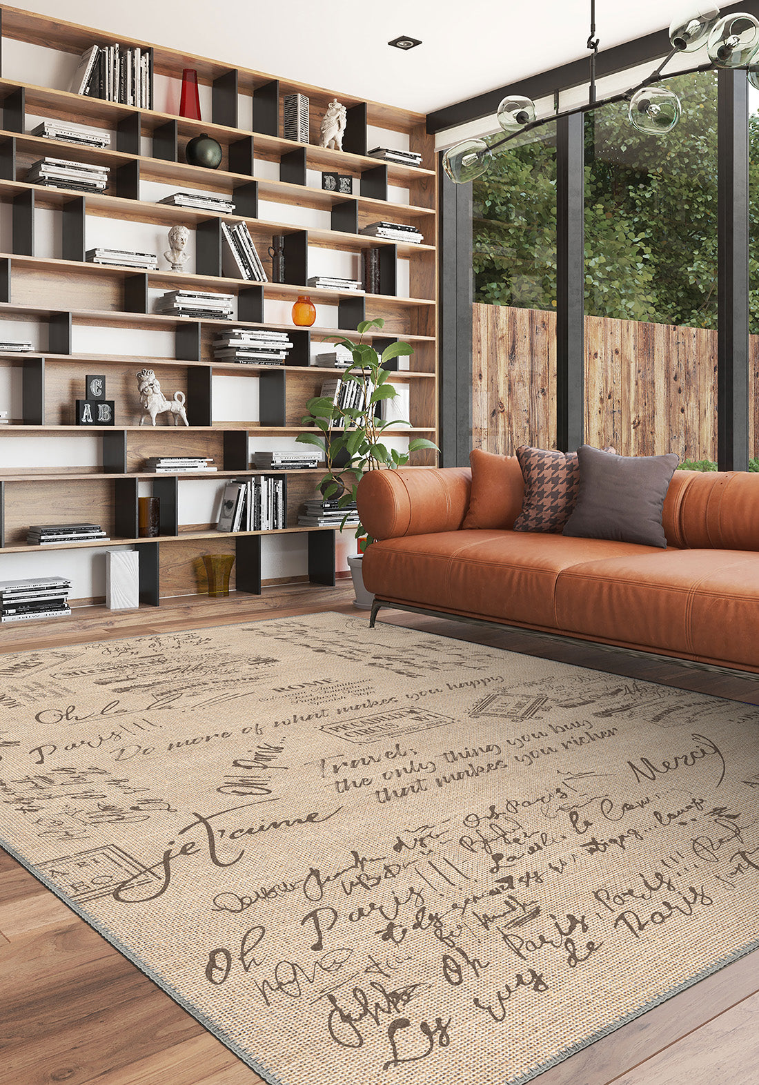 This design thrives in both indoor and outdoor spaces. Imagine it under a café table on your terrace, or softening a hallway with its nostalgic charm. It's equally suited to creative home offices, serene bedrooms, or even entryways where first impressions matter. If you love travel, books, or a hint of vintage romance, this rug belongs in your world.