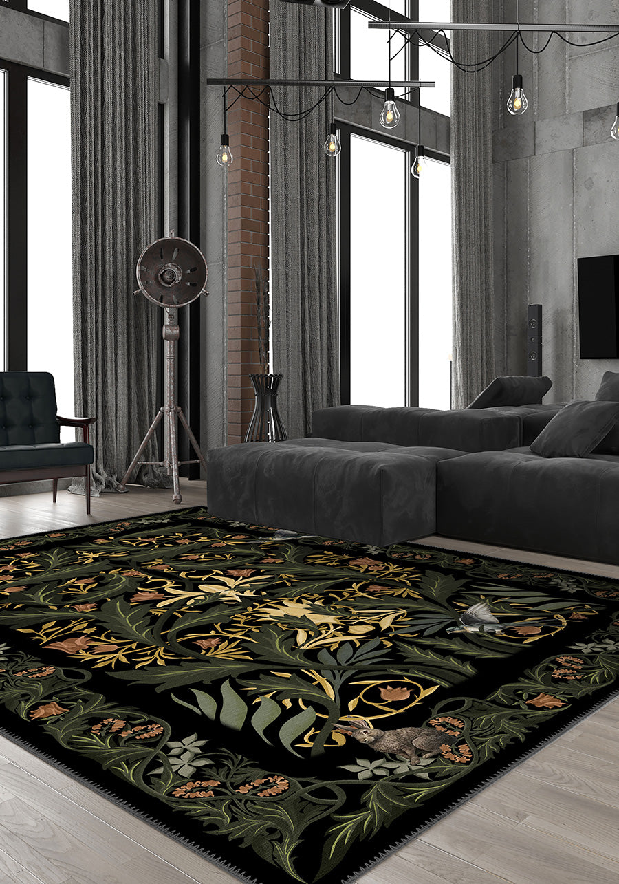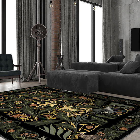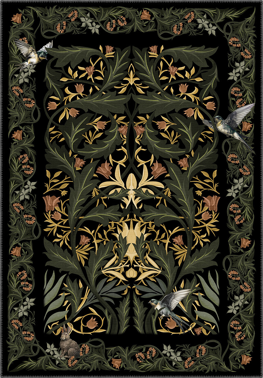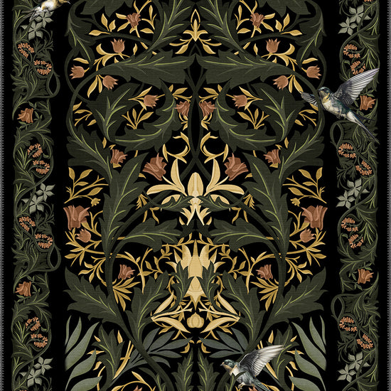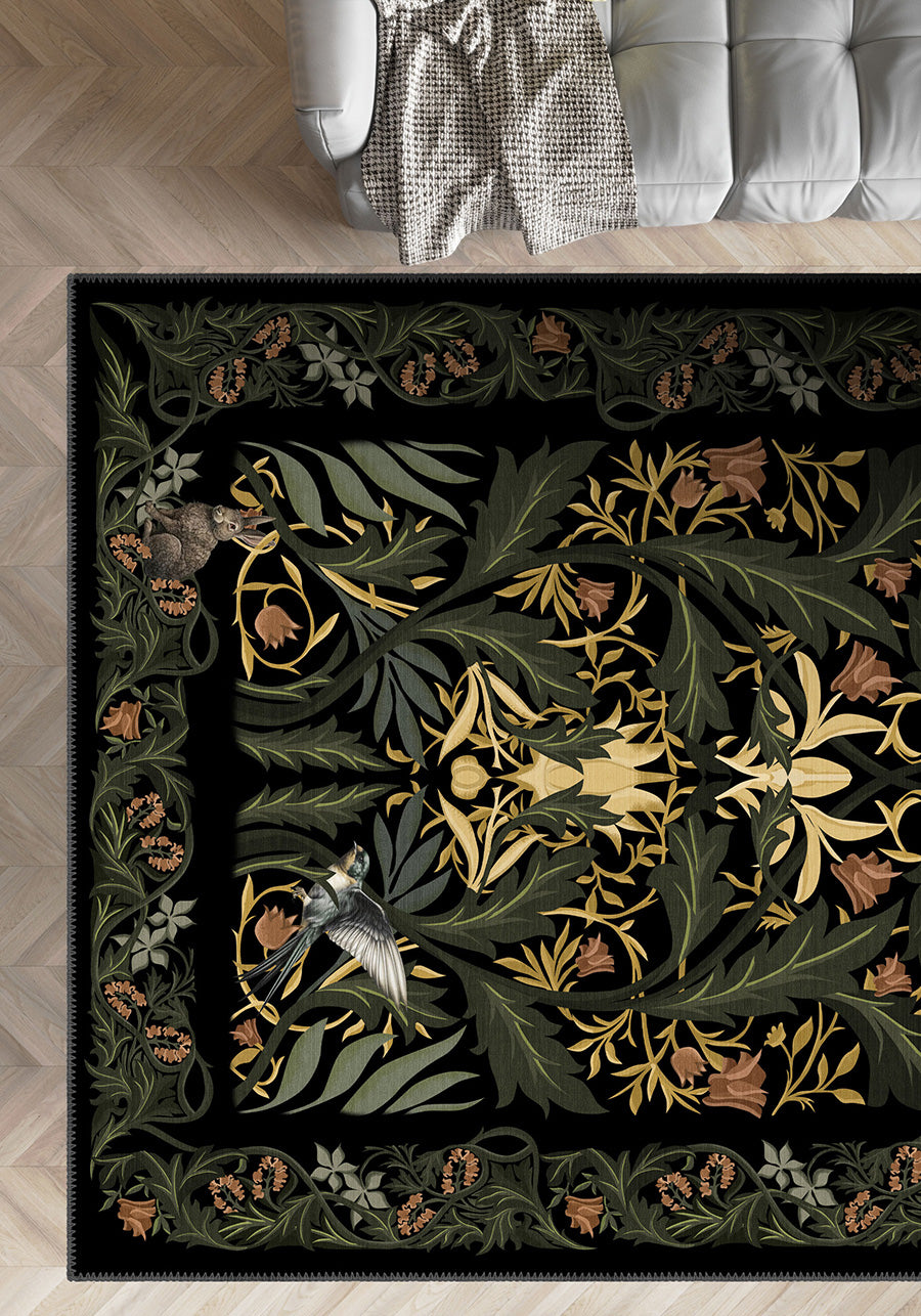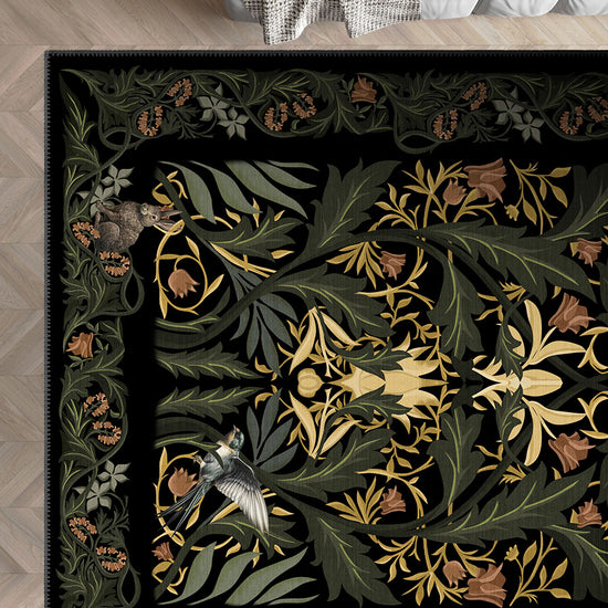The Merillo Black Botanical Rug is a striking masterpiece that brings the allure of intricate floral patterns to life. Set against a deep black background, its lush intertwining foliage, delicate blossoms, and gracefully detailed birds create a mesmerising visual symphony. The intricate border framing enhances the rich botanical elegance, making this rug a statement piece for any space.