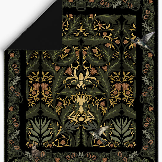 The Merillo Black Throw Blanket Bedspread is a richly detailed, heritage-inspired design created for interiors that favour depth, craftsmanship and quiet drama. Set against a deep black backdrop, intricate botanical forms unfold in layered greens, muted golds and warm earthy tones, creating a composition that feels opulent yet beautifully controlled. Every detail adds texture and story without overwhelming the space.