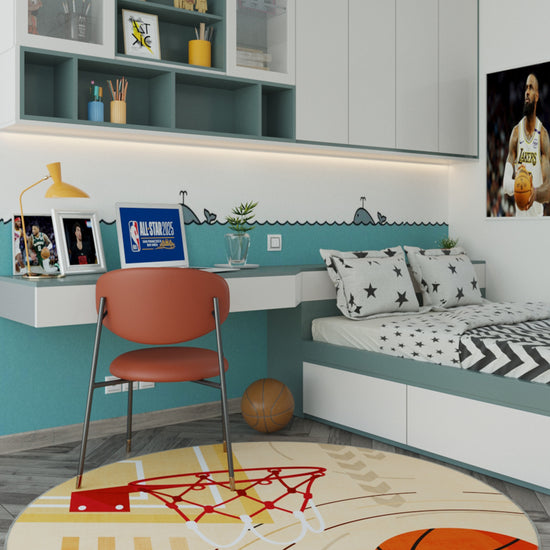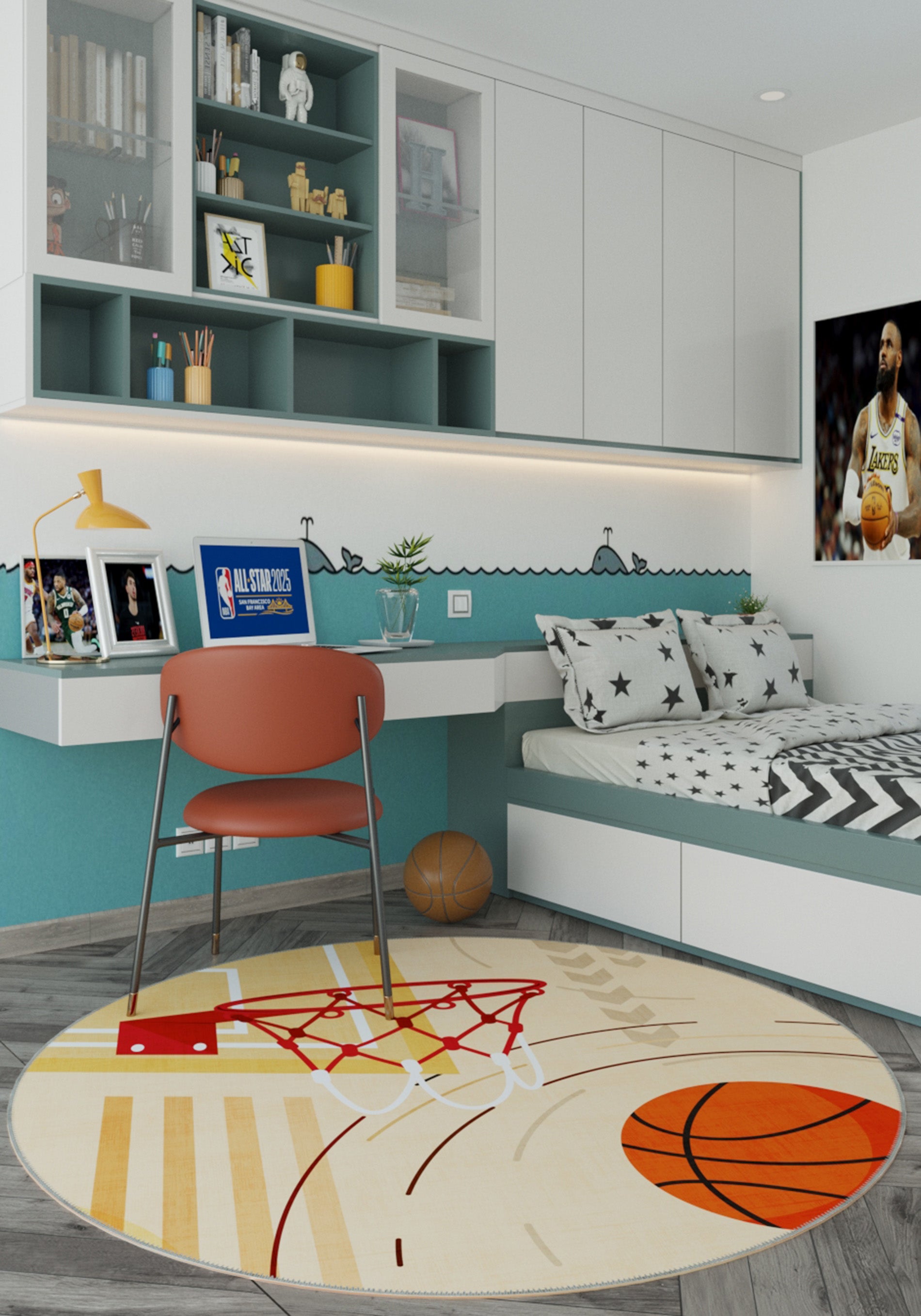 - Kids’ rooms: a playful basketball rug that fuels imagination and sporty spirit.