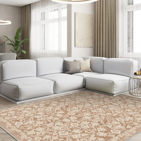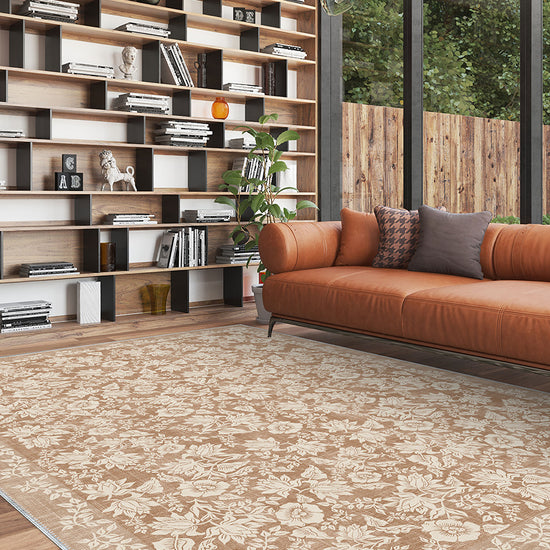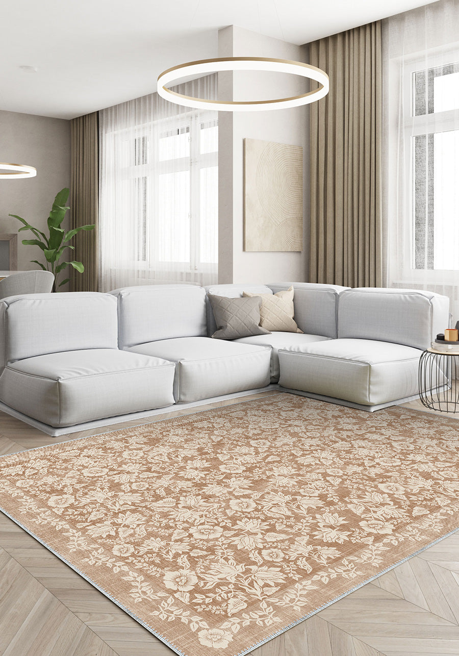 Minora Light Brown Washable Rug – Timeless Floral Elegance for Your Home