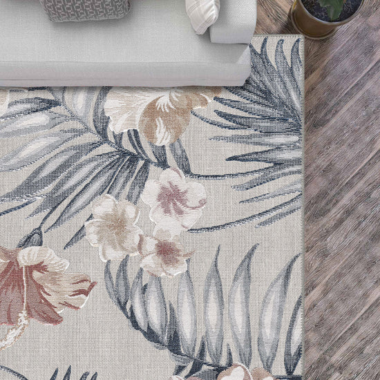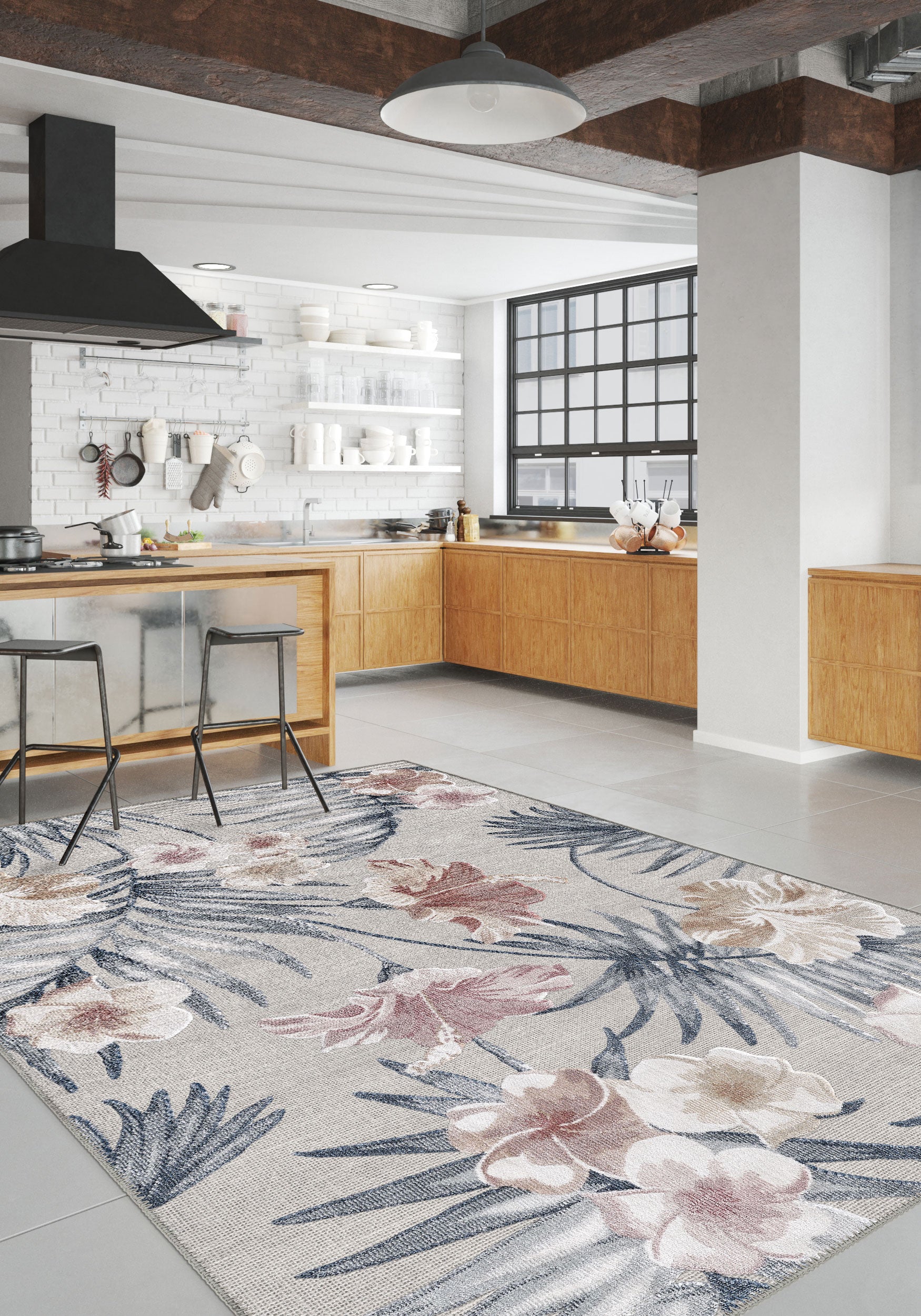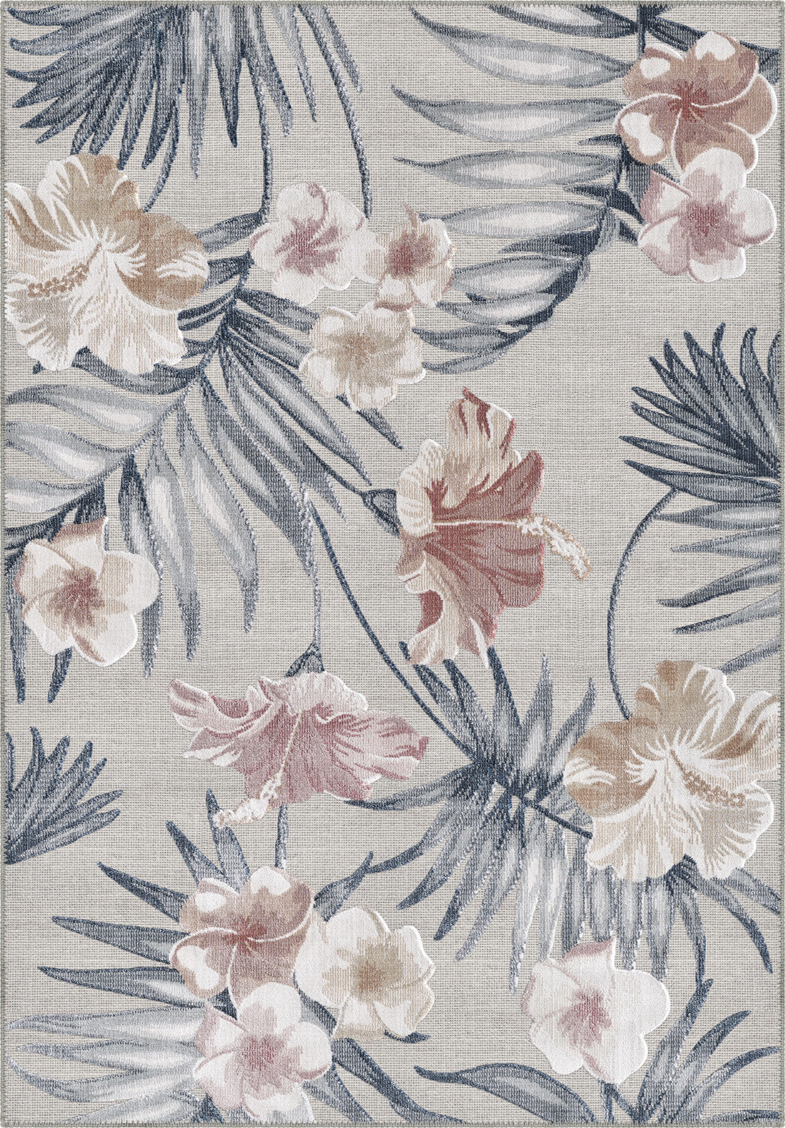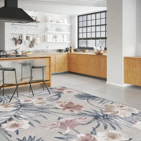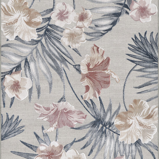 The Mira Washable Floral Rug showcases a beautiful blend of tropical floral motifs in soft pinks and neutrals, set against a modern grey backdrop. This rug is crafted from a high-quality cotton blend, ensuring it feels as luxurious as it looks, while being machine-washable for easy care.