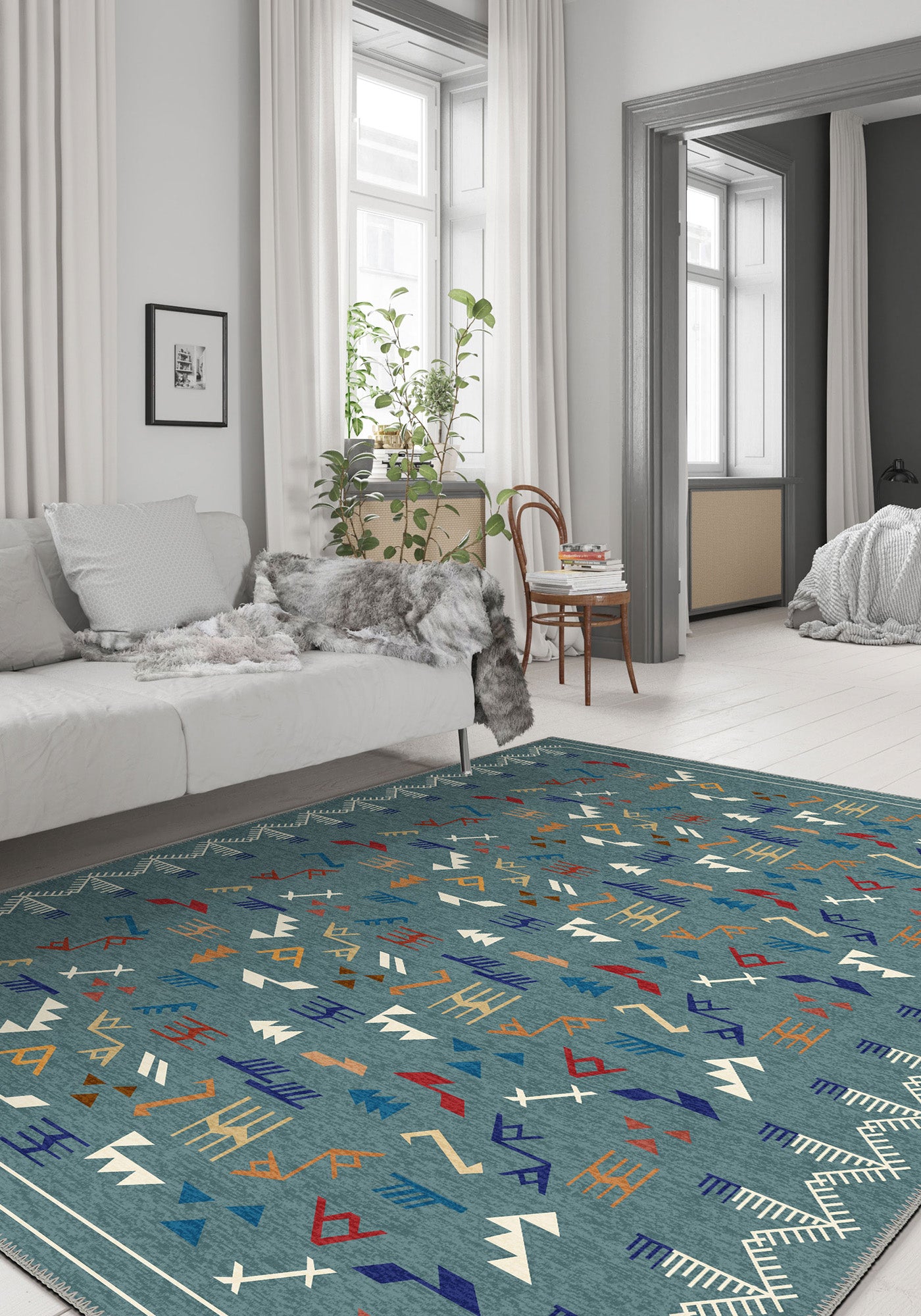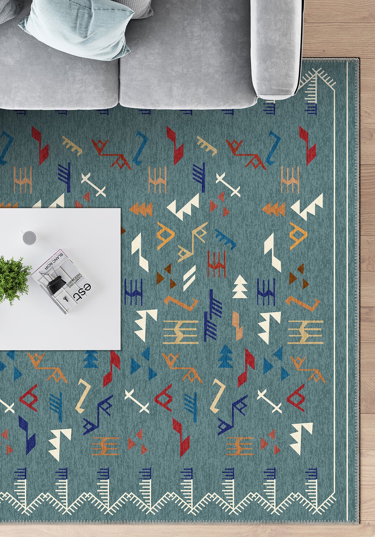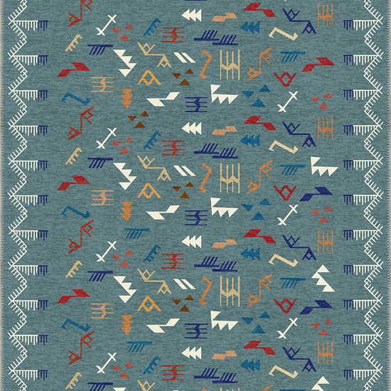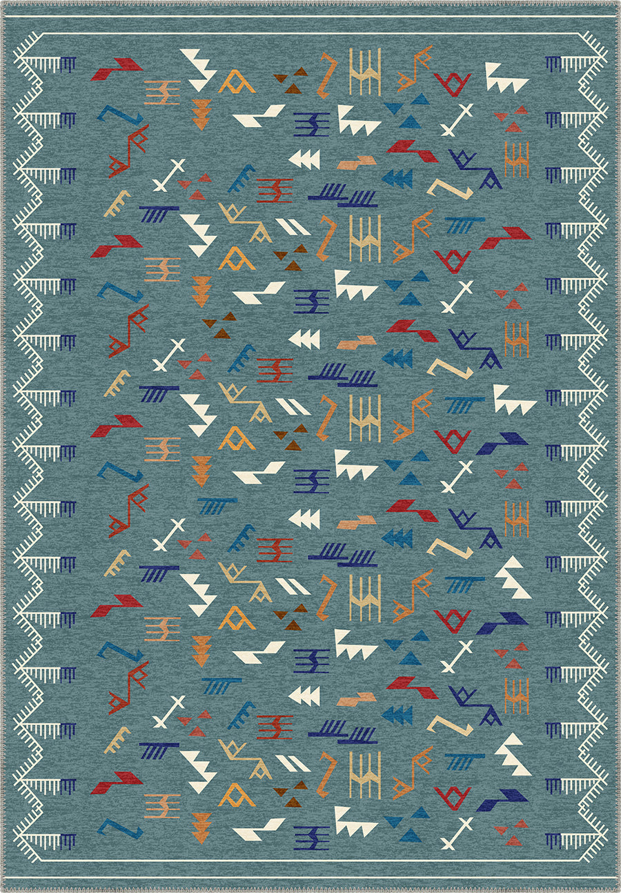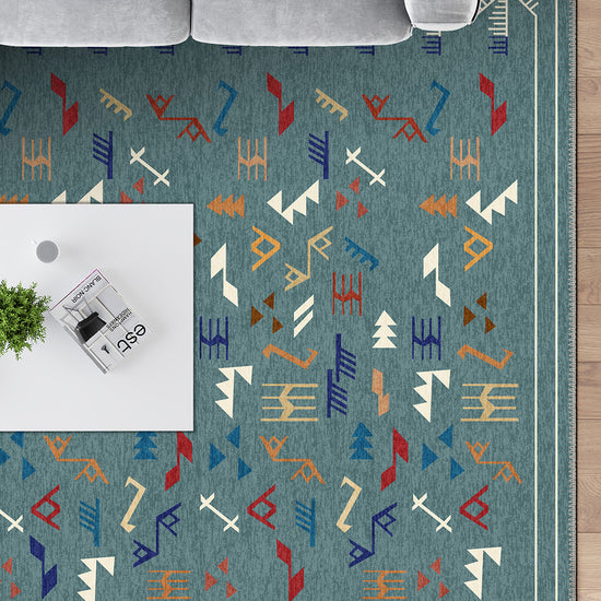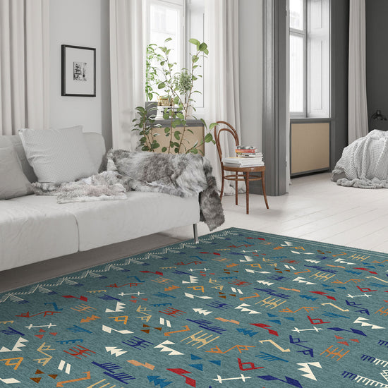 The Miran Teal Berber Rug takes its inspiration from the Berber weaving traditions of North Africa, reimagined in a bold and refreshing teal base. Scattered across the surface are abstract tribal marks—zigzags, arrows, and geometric lines—in tones of rust, ochre, indigo, ivory, and paprika, creating a vibrant visual rhythm.
