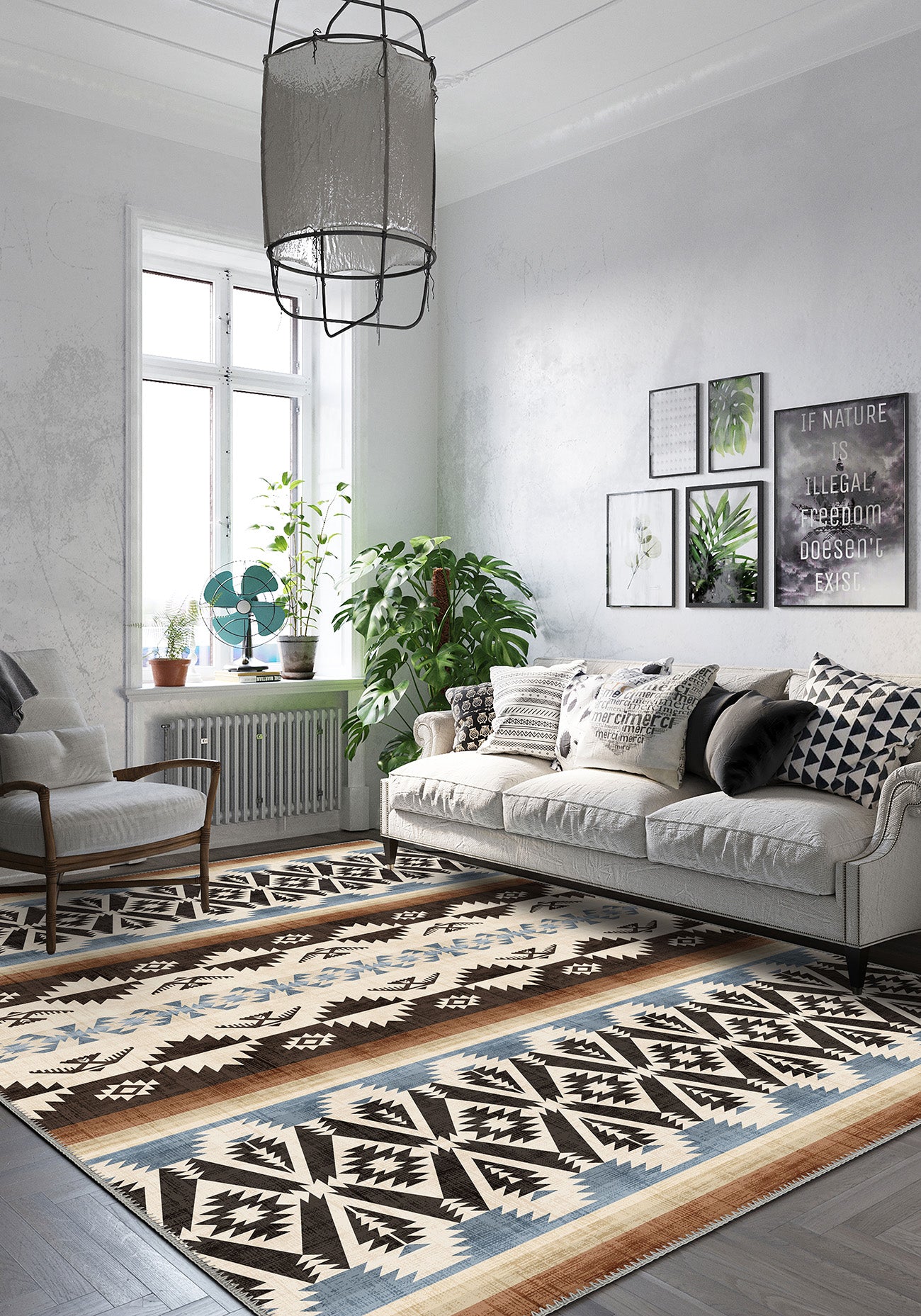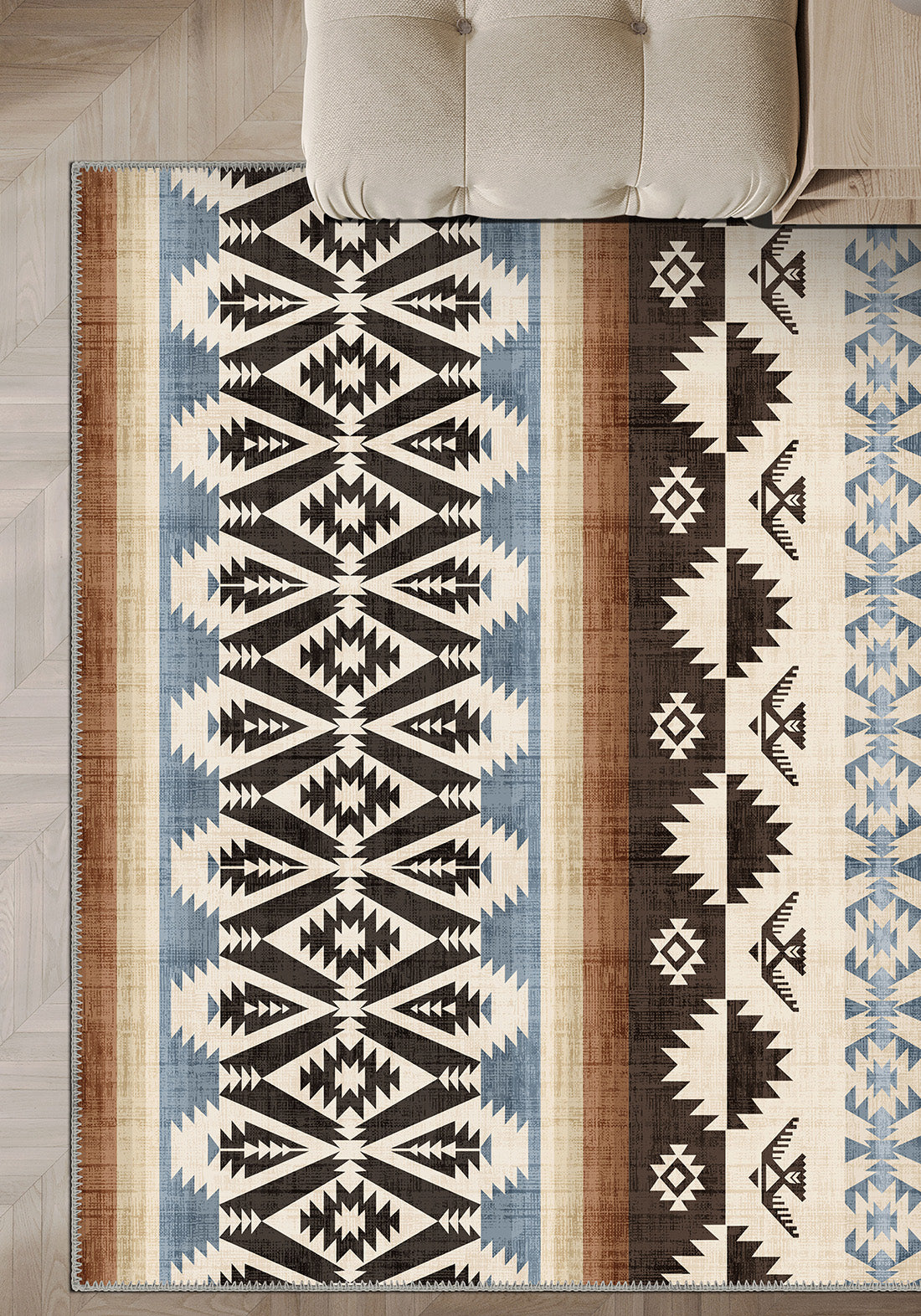 - Layered geometric bands that bring rhythm and texture to the room