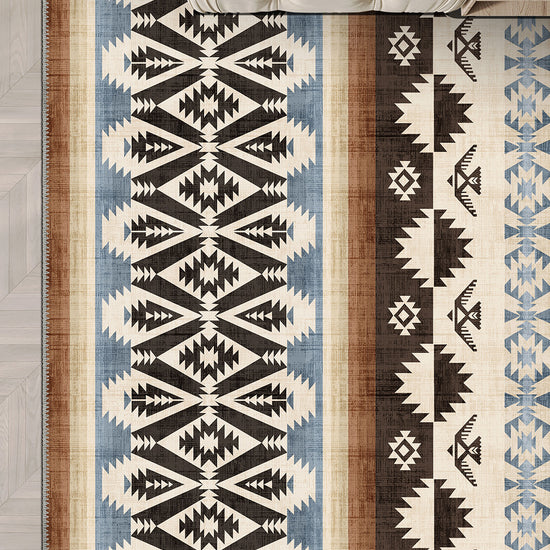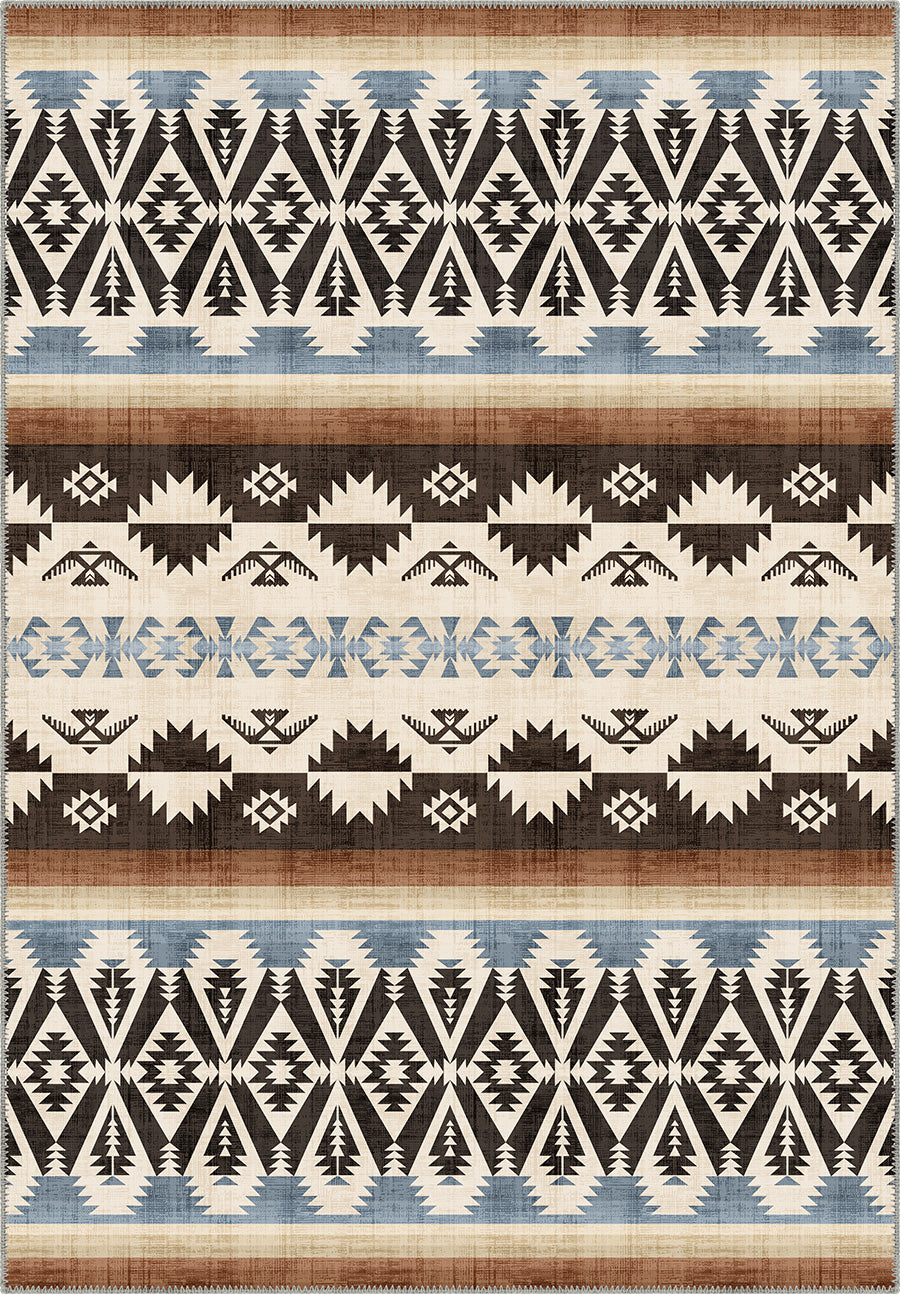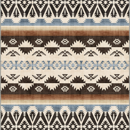 - Dynamic tribal-inspired pattern in earthy black, brown, beige, and blue