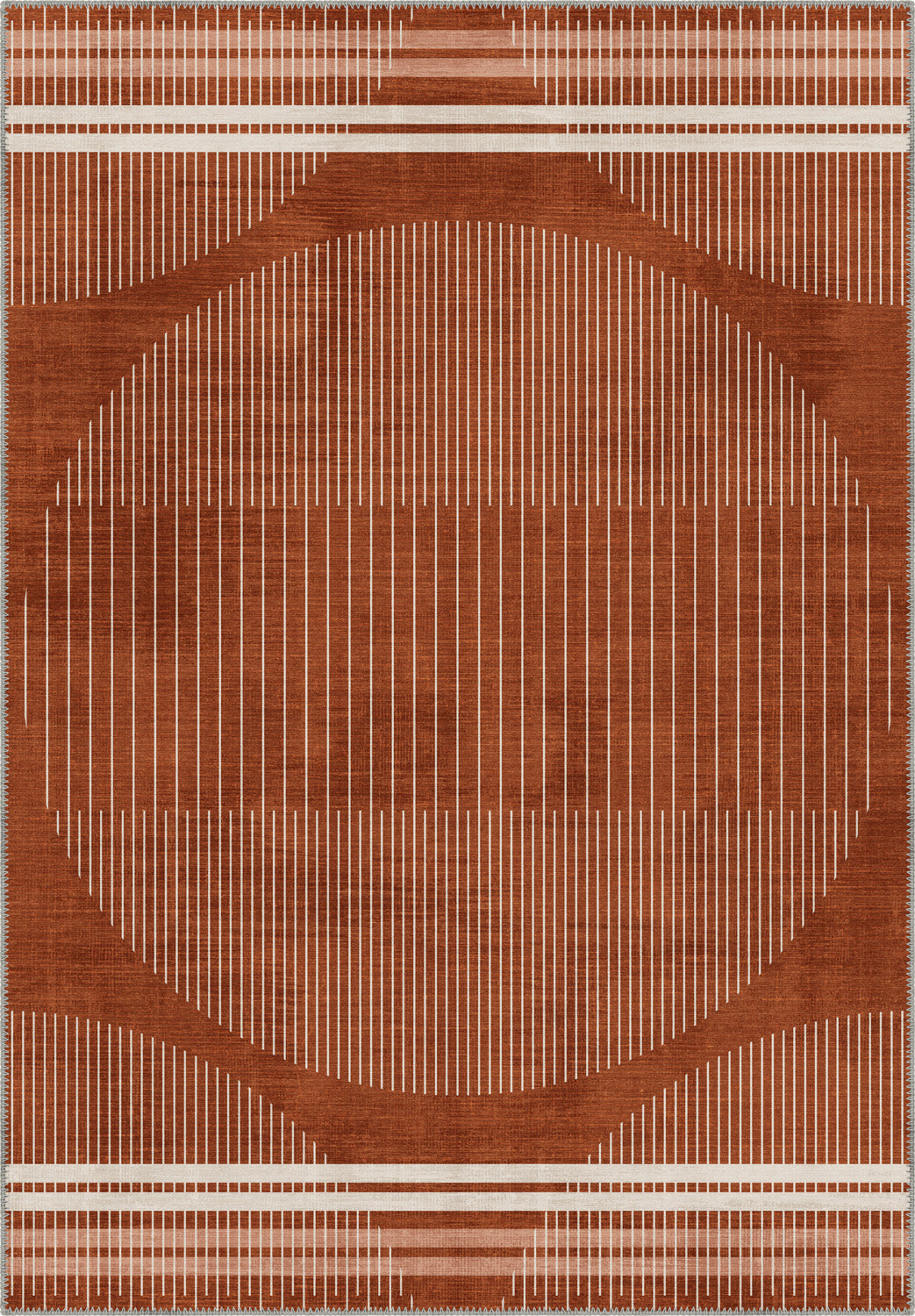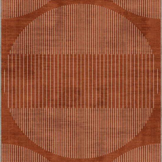 If mid-century architecture and earthy minimalism had a lovechild, it would look like the Nathan Modern Cinnamon Rug. This design brings structure and soul in equal measure, with its sculptural oval formed from crisp vertical lines across a rich cinnamon backdrop. Cream and soft rust details create contrast without chaos—ideal for homes that favour warmth, balance, and intention.