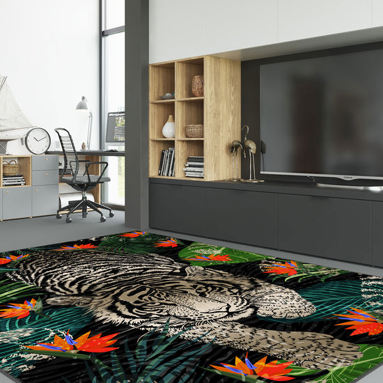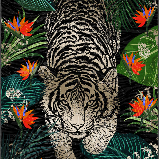 - Eye-catching jungle motif featuring a central tiger surrounded by tropical foliage