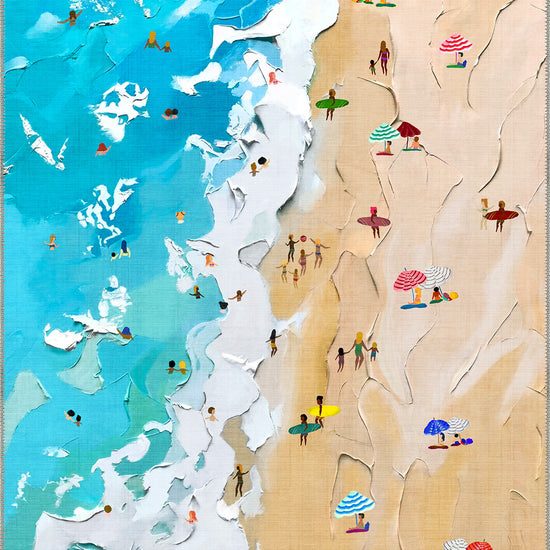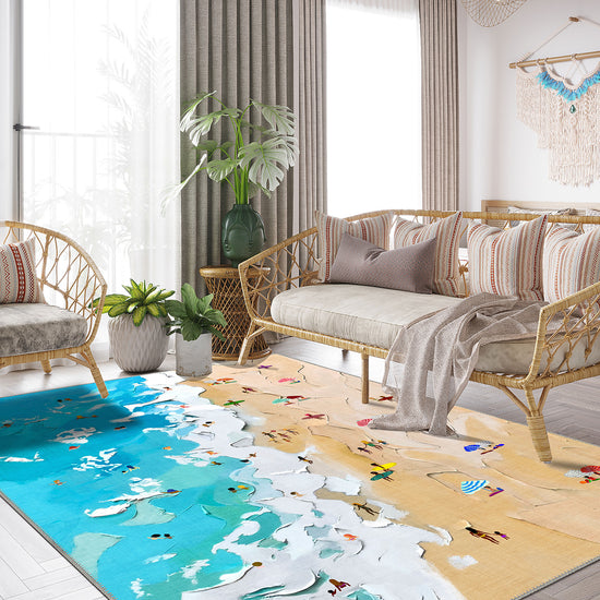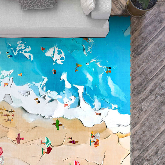 The Nico Coastal Vibes Rug captures the joy of a sun-drenched beach day, where turquoise waves roll onto golden sand and tiny sunbathers dot the shoreline. With painterly textures and whimsical detail, this rug is a coastal postcard come to life. It’s fun, fresh, and full of character—perfect for anyone who dreams of summer, all year long.
