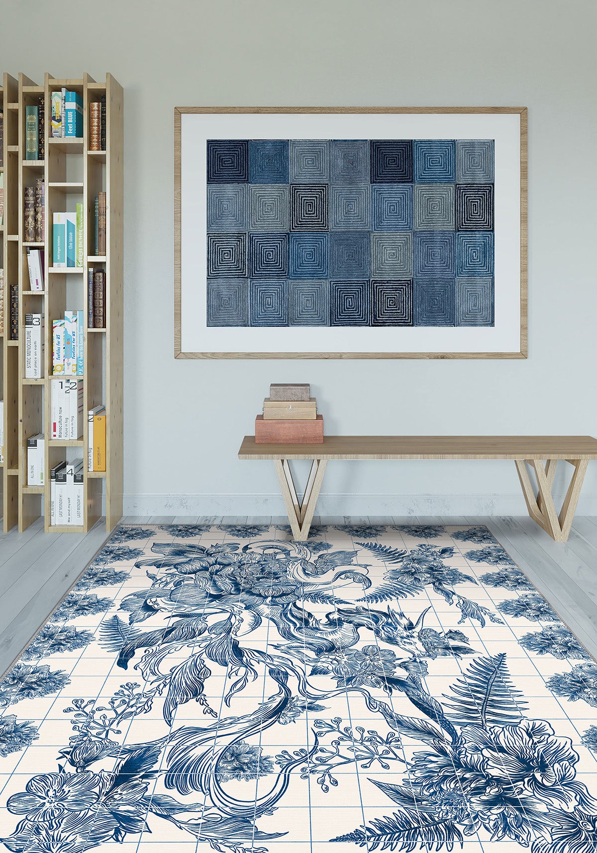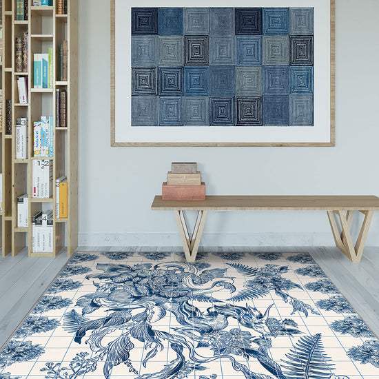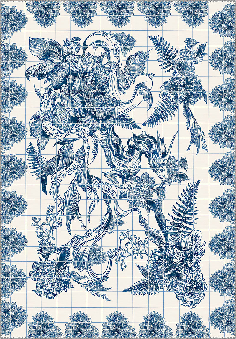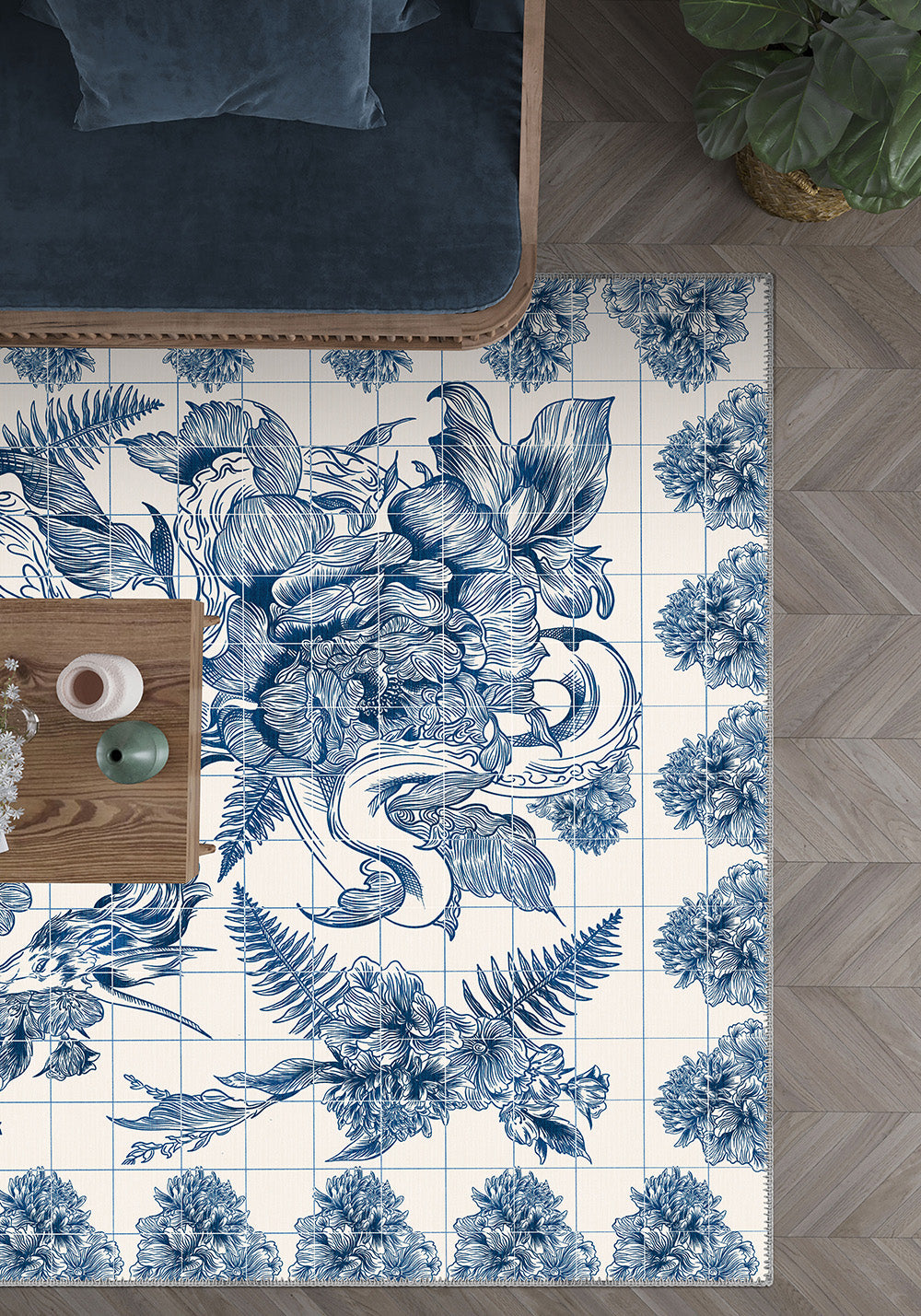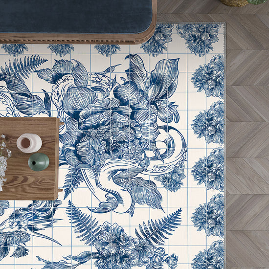 Nino Gothic Tile Rug – Bleu et Blanc Elegance with a Toile Twist