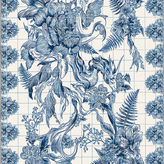 The Nino Gothic Tile Rug is a refined tribute to European craft traditions—merging the poetic charm of Toile de Jouy with the structured rhythm of vintage ceramic tiling. Featuring intricate navy botanical illustrations laid across a pale ivory grid, it echoes the timeless beauty of bleu et blanc French ceramics and 18th-century printed textiles. The design feels like a mural beneath your feet—elegant, airy, and brimming with quiet drama.