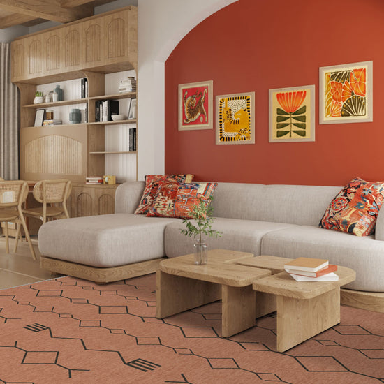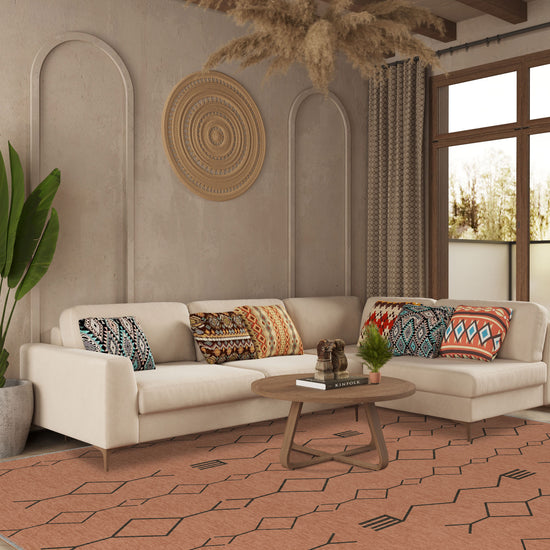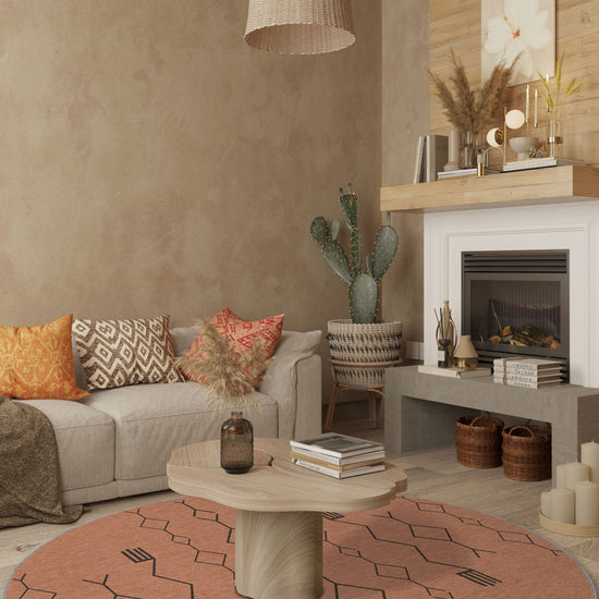 The Nira Terracotta Berber Rug is a quiet tribute to ancestral motifs, reimagined for modern souls. With its minimalist tribal linework in deep charcoal tones etched across a warming terracotta canvas, it’s a grounding presence—earthy, raw, and refined.