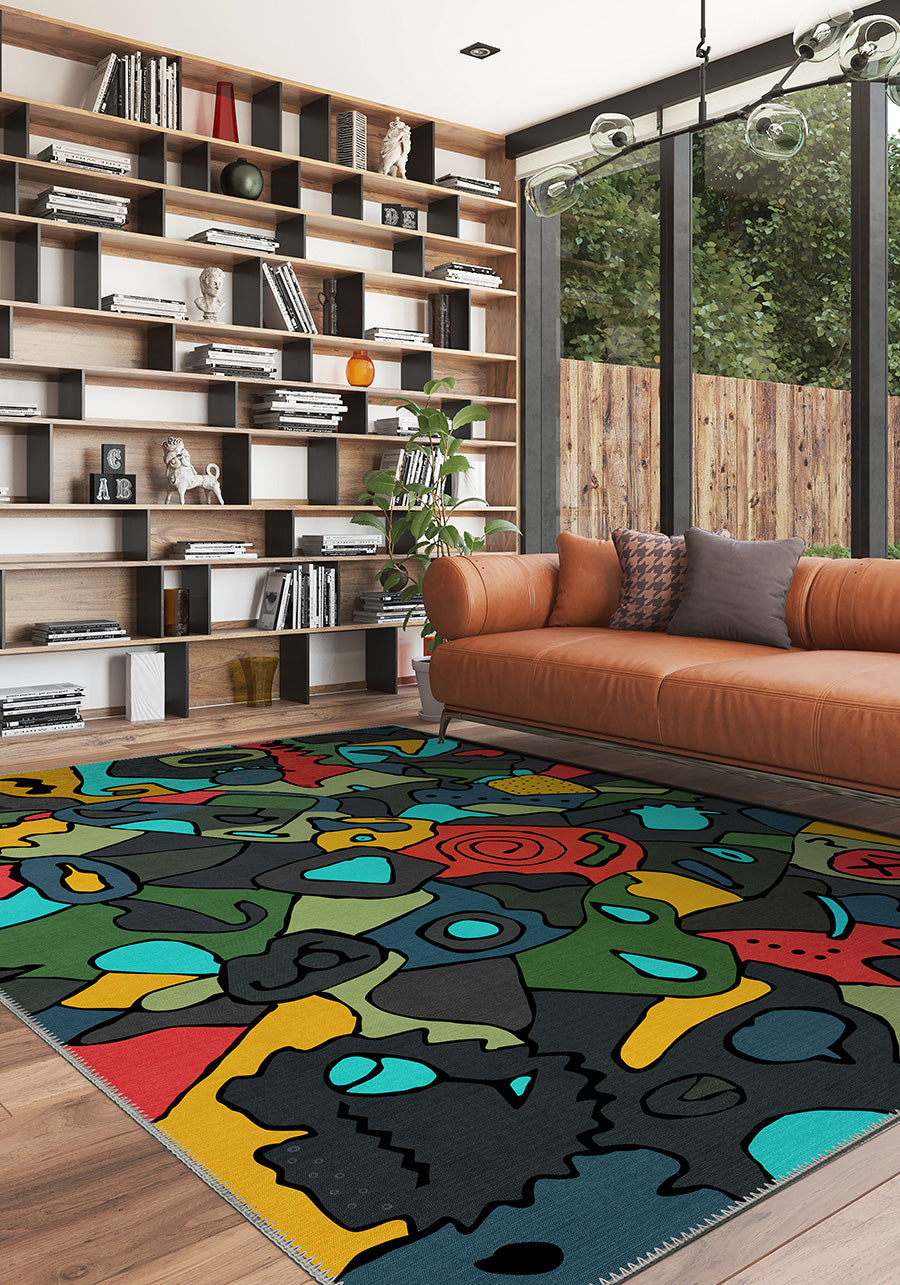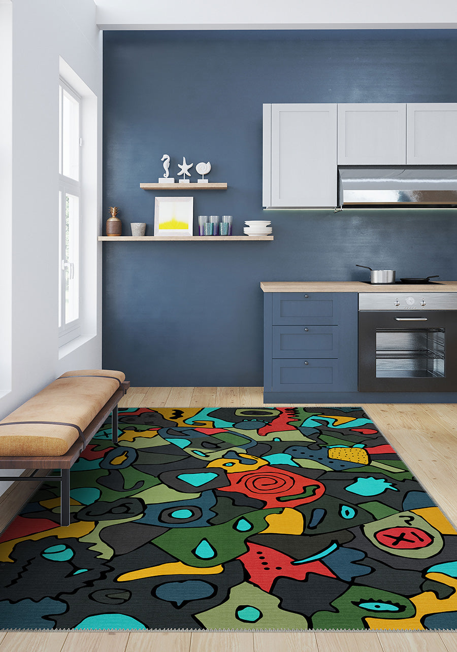 Beyond its artistic appeal, this rug is crafted for everyday living. Machine washable and designed with a durable low-pile texture, it remains dust-free and hypoallergenic, offering a seamless blend of functionality and modern aesthetics.