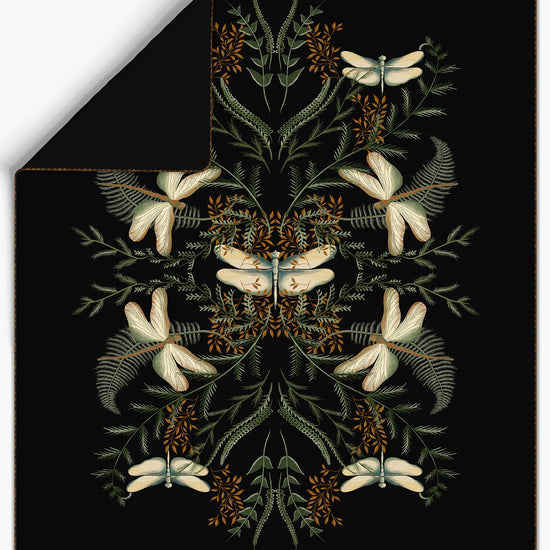 The Orithia Black Throw Blanket is a quiet celebration of nature, drama, and detail. Set against a deep black base, delicate botanical forms and softly illustrated insects create a symmetrical composition that feels both poetic and confident. It is the kind of botanical black blanket that instantly elevates a space, adding depth without overwhelming it.