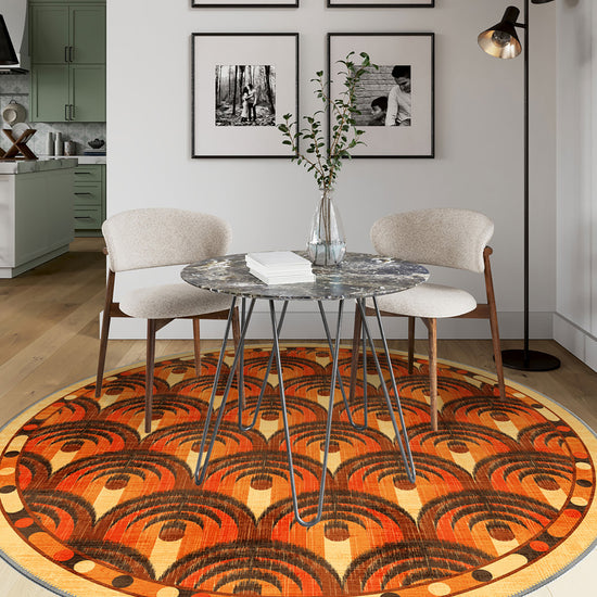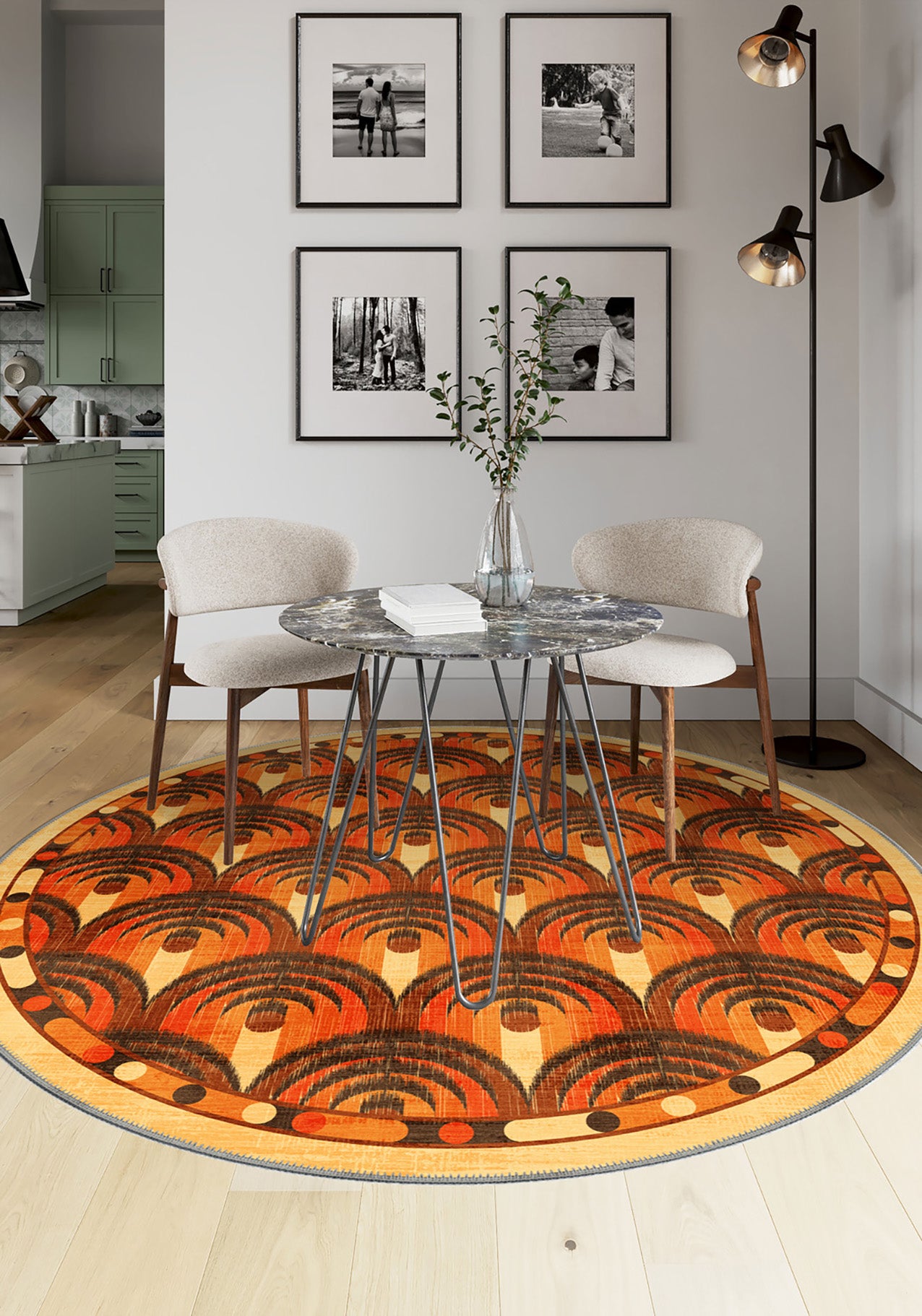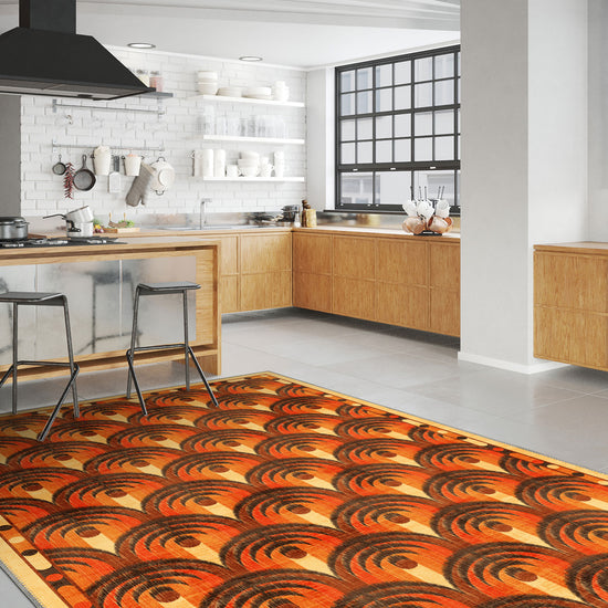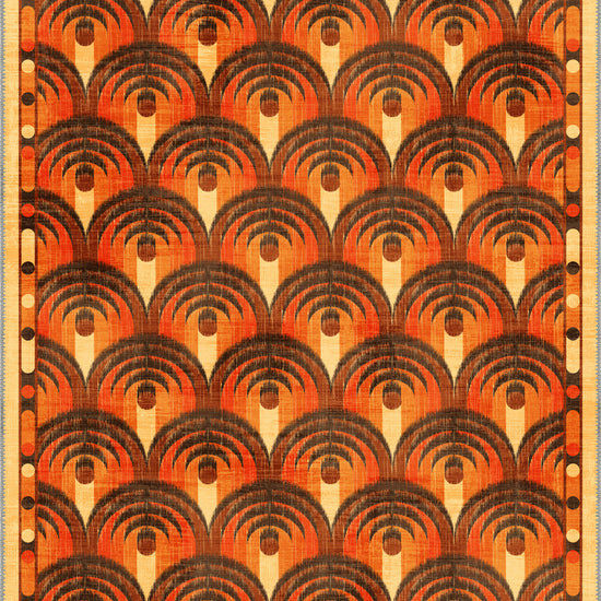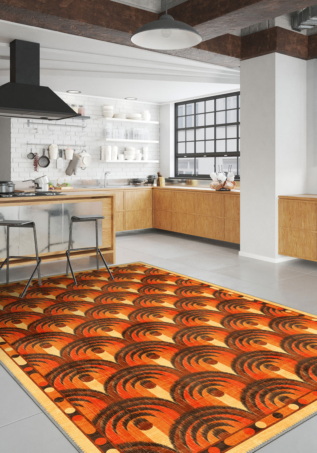 Step into a world where design doesn’t whisper—it grooves. The Orlan Ikat Retro Rug is a celebration of fearless pattern, rhythm, and rich amber warmth. A cascade of ikat-inspired arches layered in tonal burnt orange, cinnamon, and honey gives this rug a nostalgic flair that nods to vintage wallpaper, vinyl records, and sun-drenched Californian lounges. It’s every bit as daring as it is comforting.