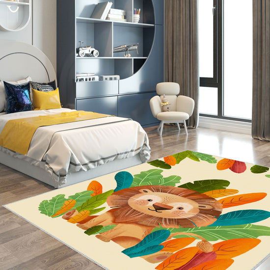 The Paxton Colourful Kids Washable Rug brings a burst of joy and creativity into any child’s room. Featuring a playful lion set amongst bold, leafy greenery in bright, engaging colours, this rug is sure to capture the imagination of little adventurers. With its fun design and practical features, this rug offers the perfect balance of fun and function for busy households.