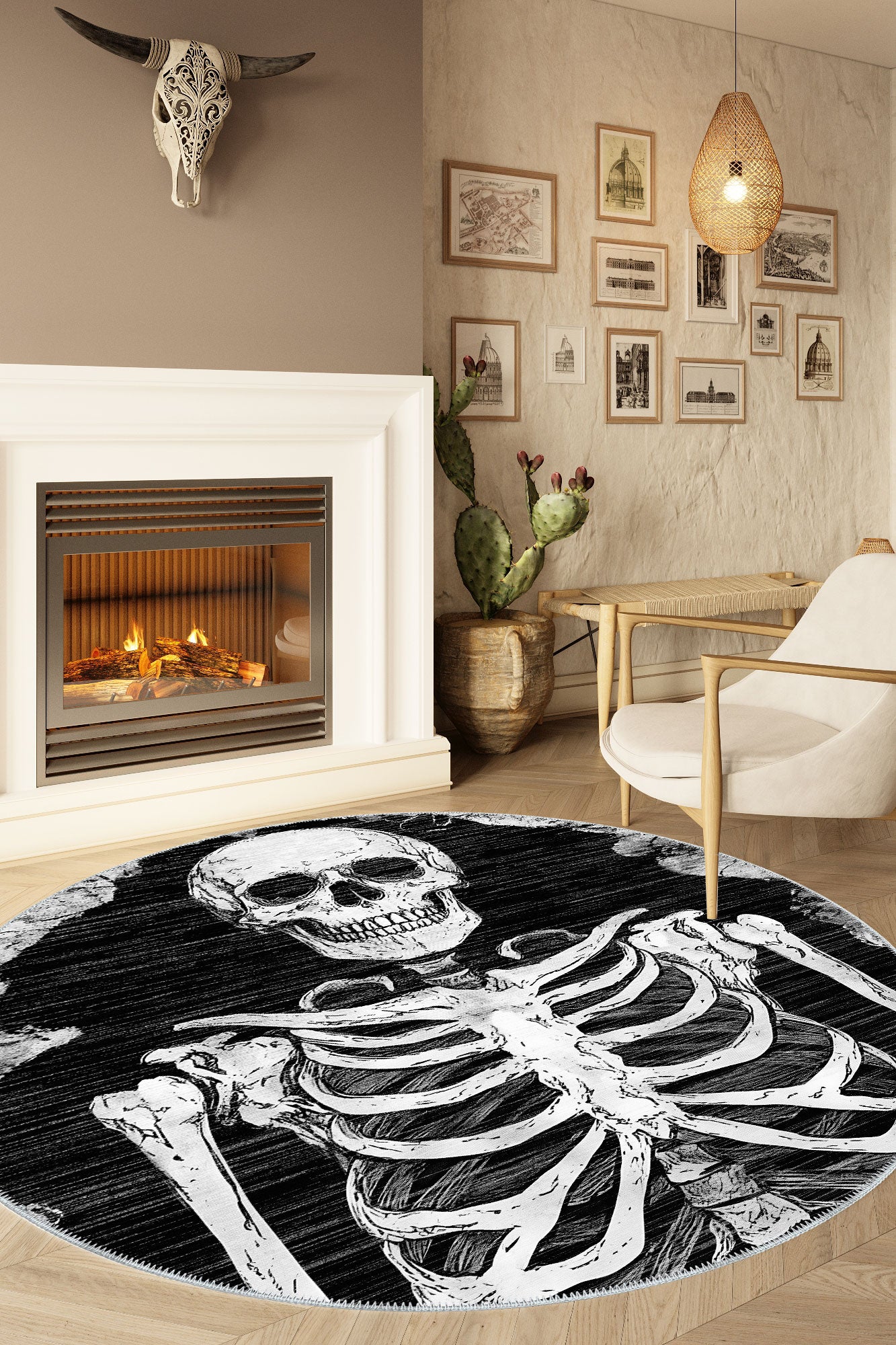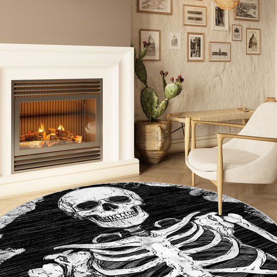 - Bold Monochrome Palette: The black background and white skeletal design make this rug a dramatic statement piece that works well in both dark and light interior themes.