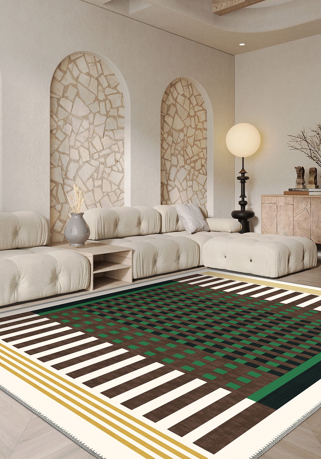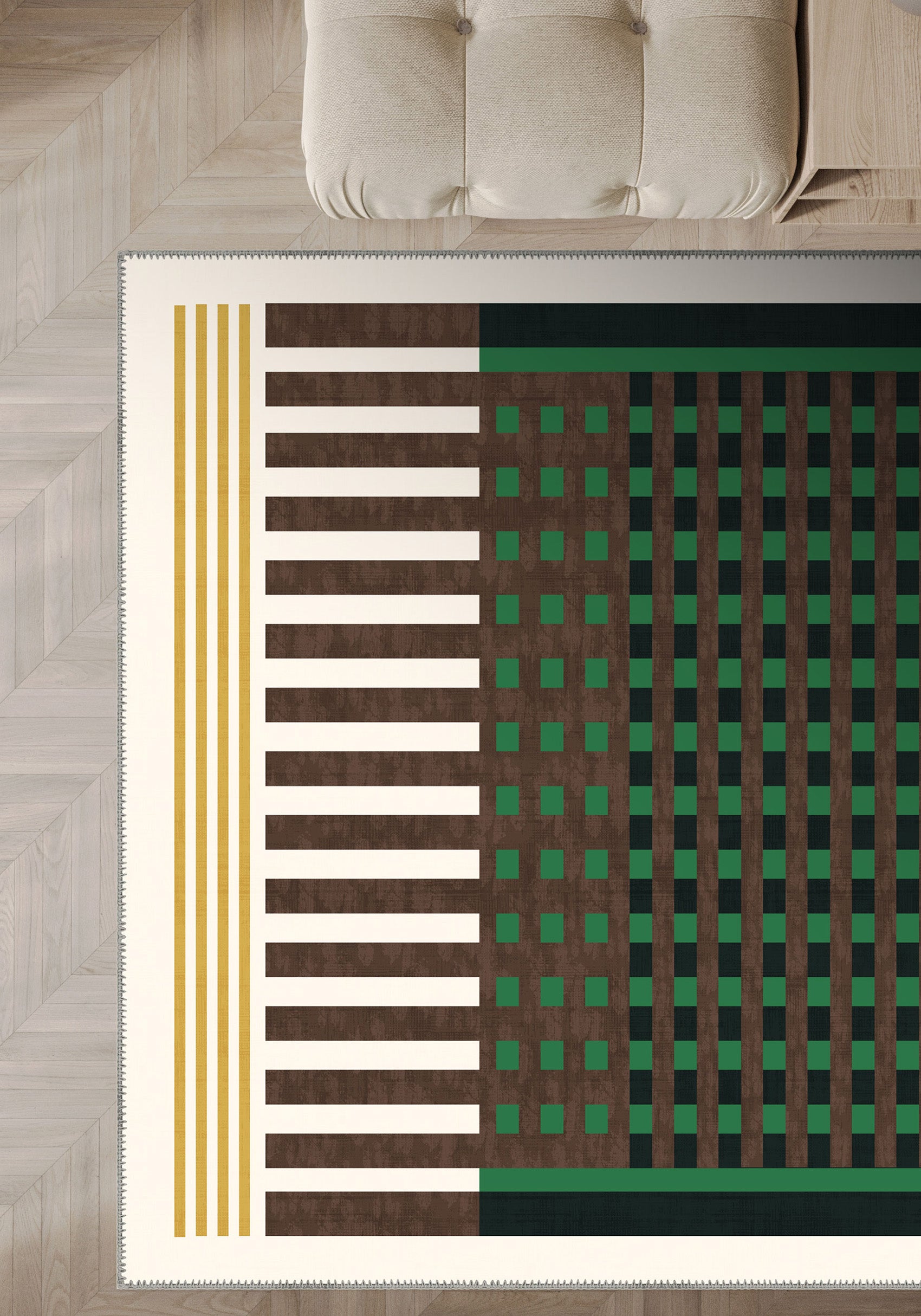 The Quillon Green Plaid Rug is a masterclass in structure and contrast. With its forest green and deep chocolate grid layered over ivory and ochre lines, this rug feels both retro and radically modern. The crisp plaid formation is softened by earthy tones, making it a standout piece that remains grounded in nature. Minimalist yet bold, Quillon adds architectural rhythm to any room it touches.