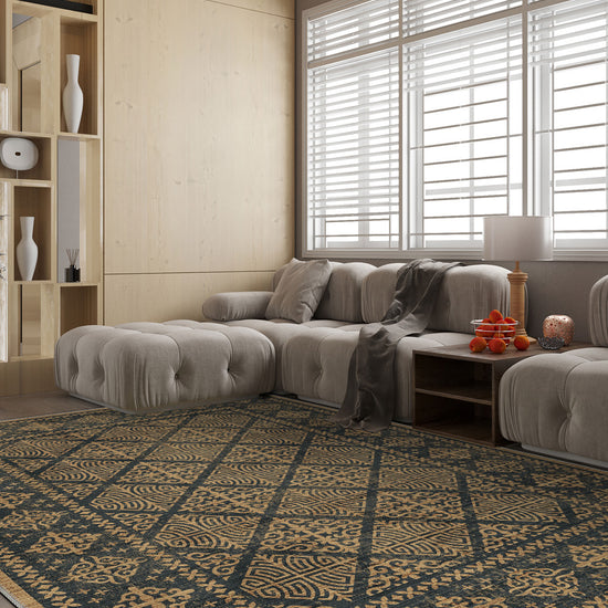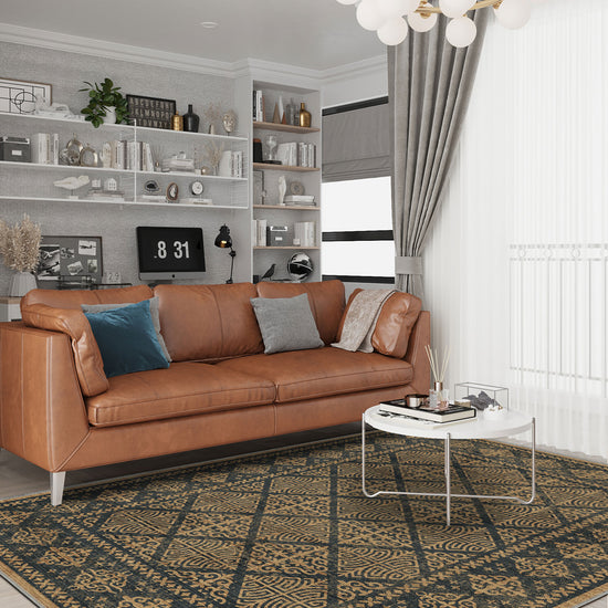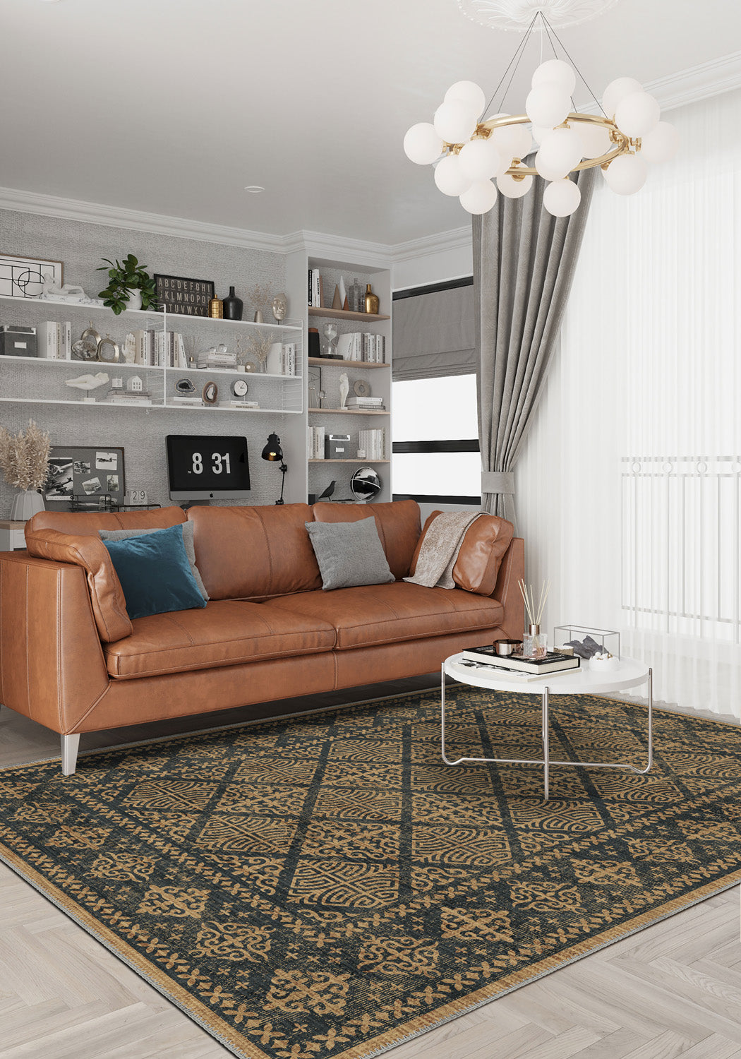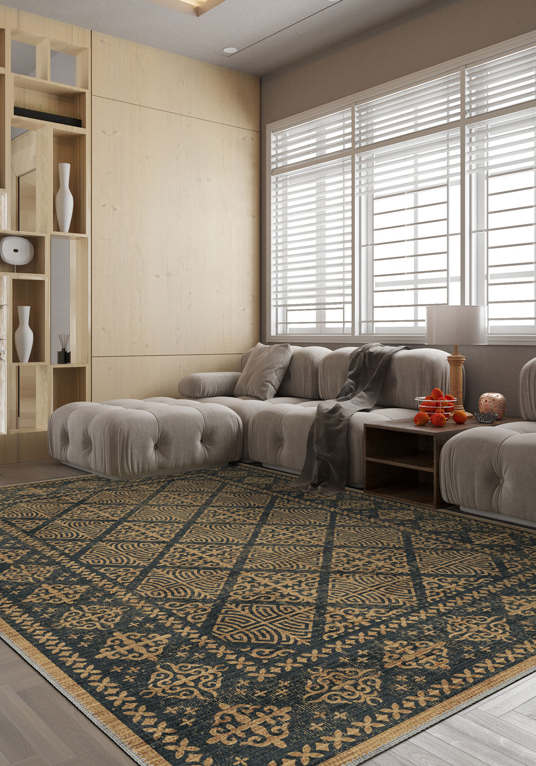 With its hauntingly beautiful palette of charcoal gray and burnished gold, the Rhean Gothic Gray Rug feels like it’s been lifted from a cathedral cloister. Its elegant diamond composition, echoed by ancient medallion motifs, is a poetic marriage of Gothic geometry and modern restraint—ideal for interiors that lean into drama, depth, and a touch of mystery.