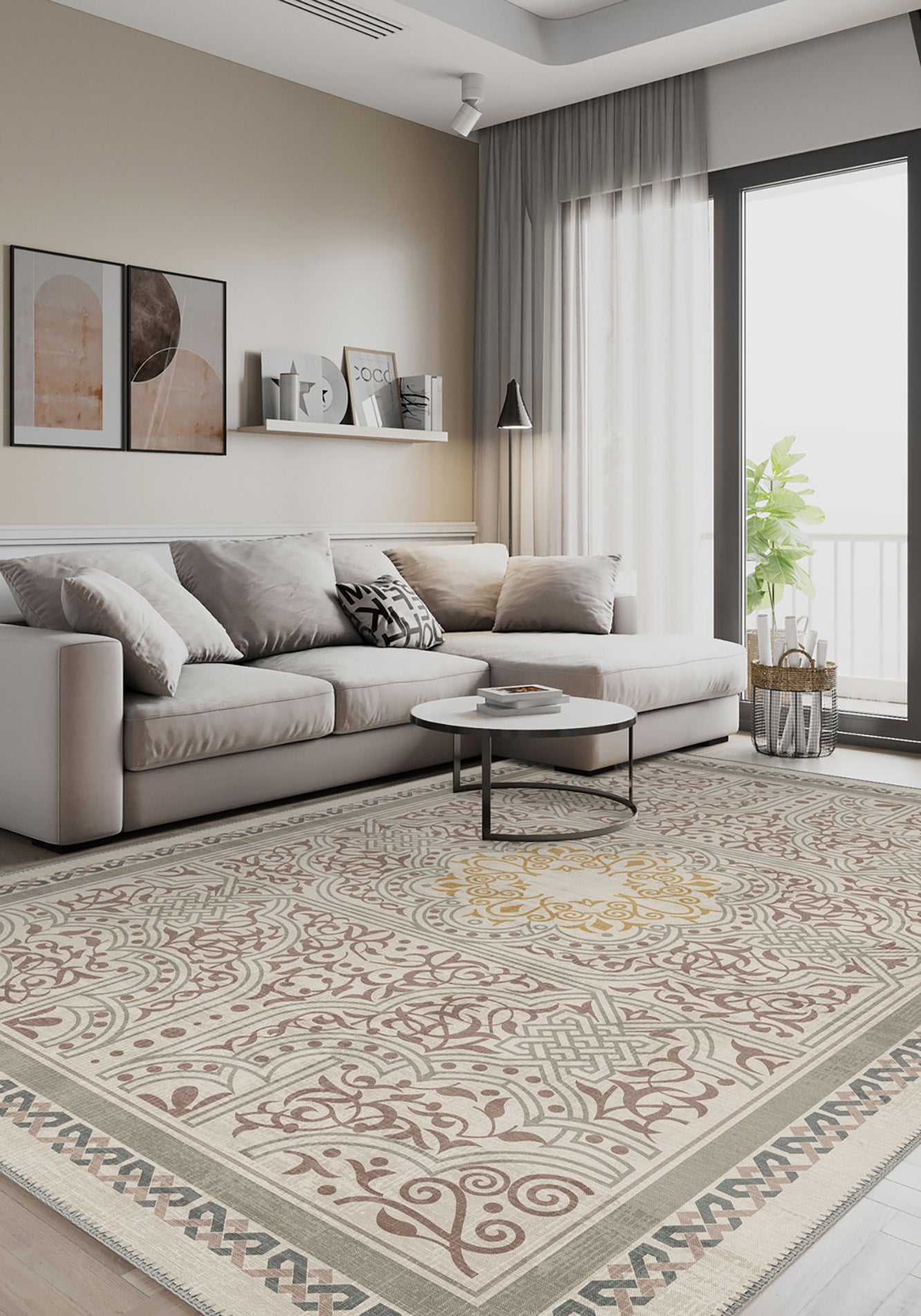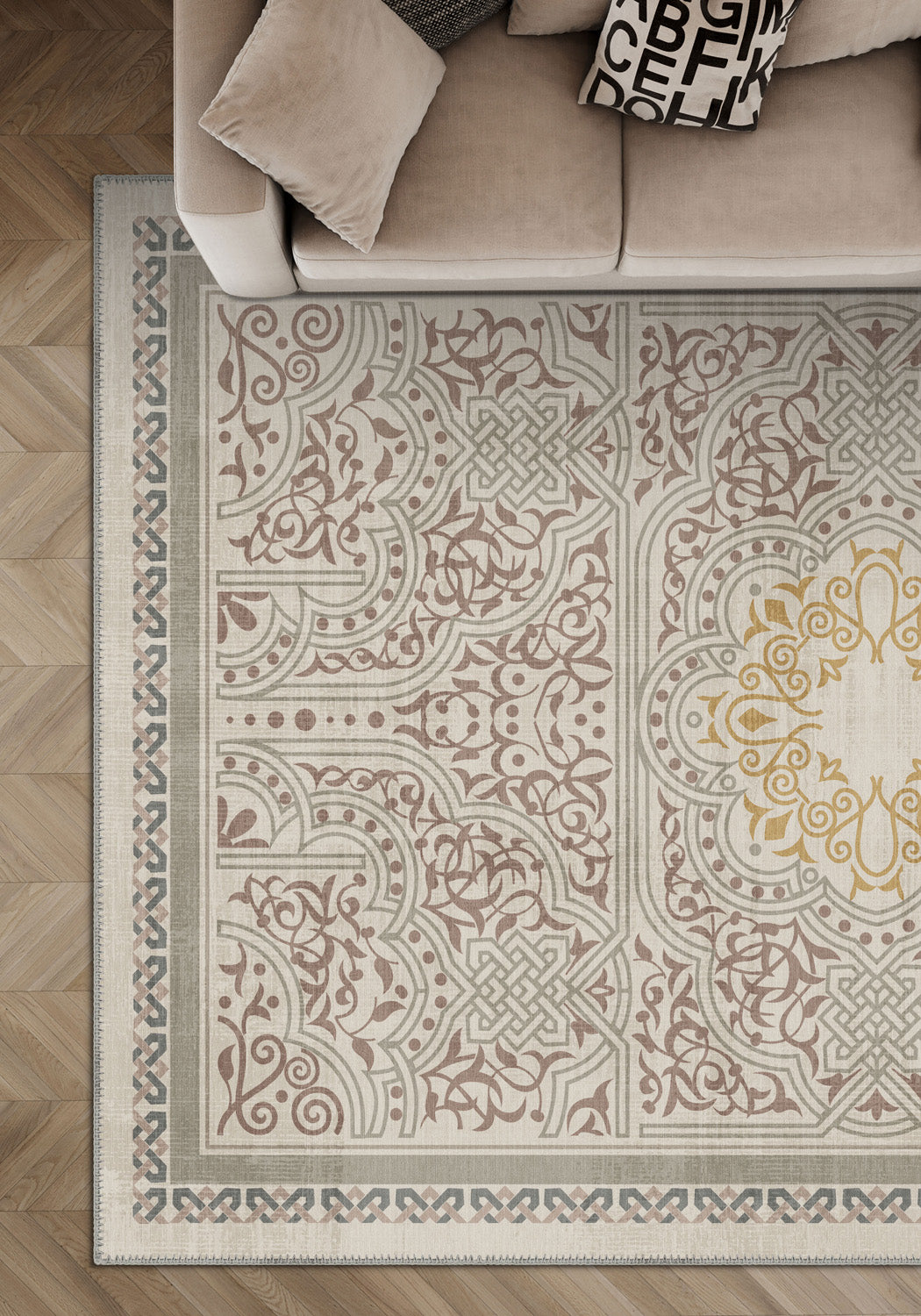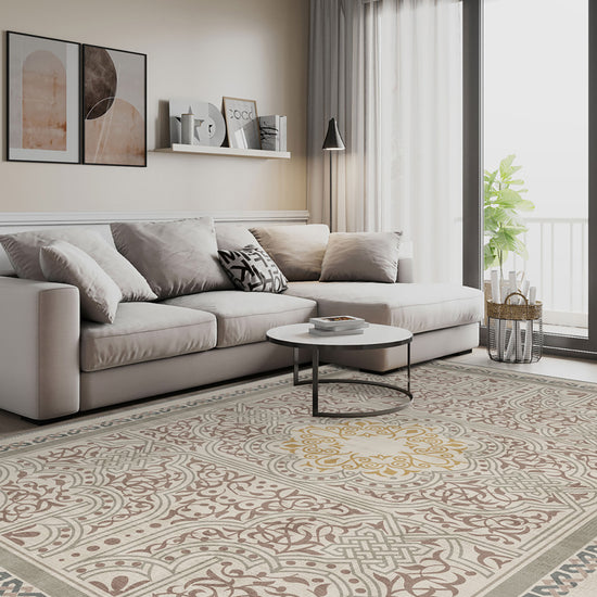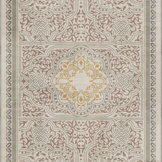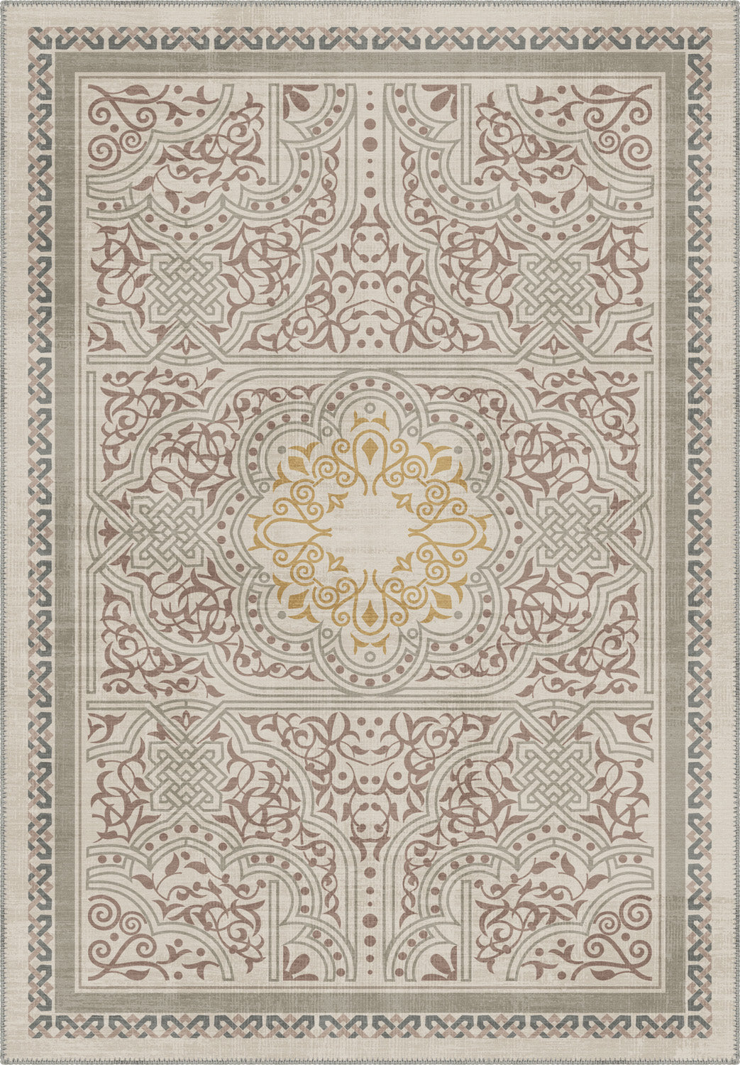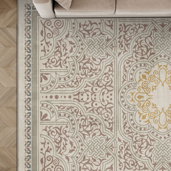 Rooted in ancient symbolism and rendered with contemporary softness, the Ronan Celtic Taupe Rug is where tradition meets tranquility. The intricate interlace patterns and floral scrolls speak of Celtic legacy, while the muted taupe and sage green palette gently grounds your space in calmness. At the heart of it all, a golden medallion radiates quiet confidence—like a sunbeam on stone.
