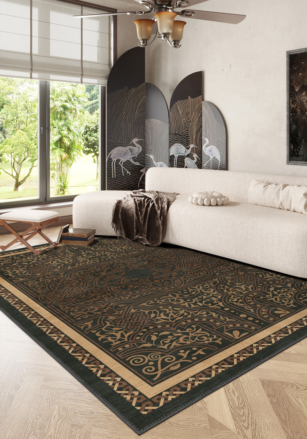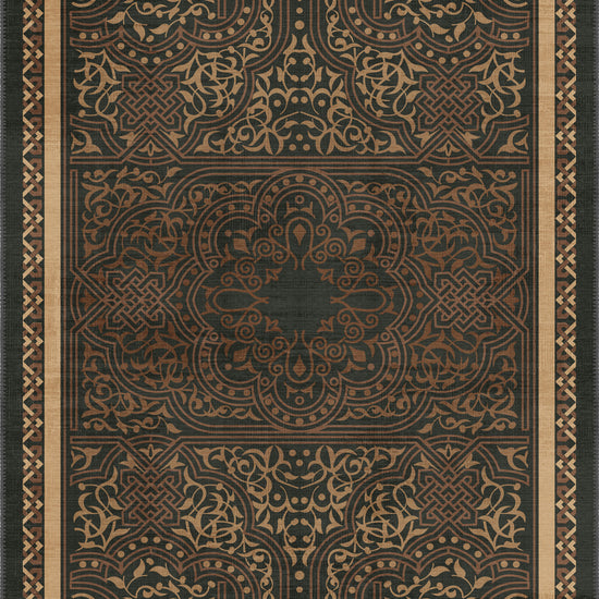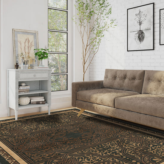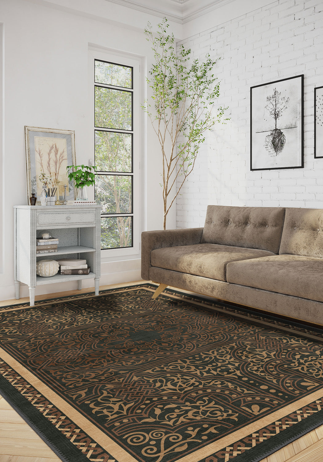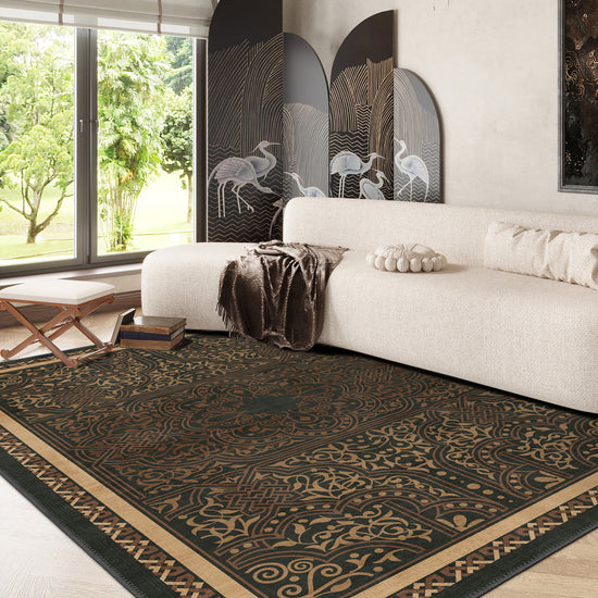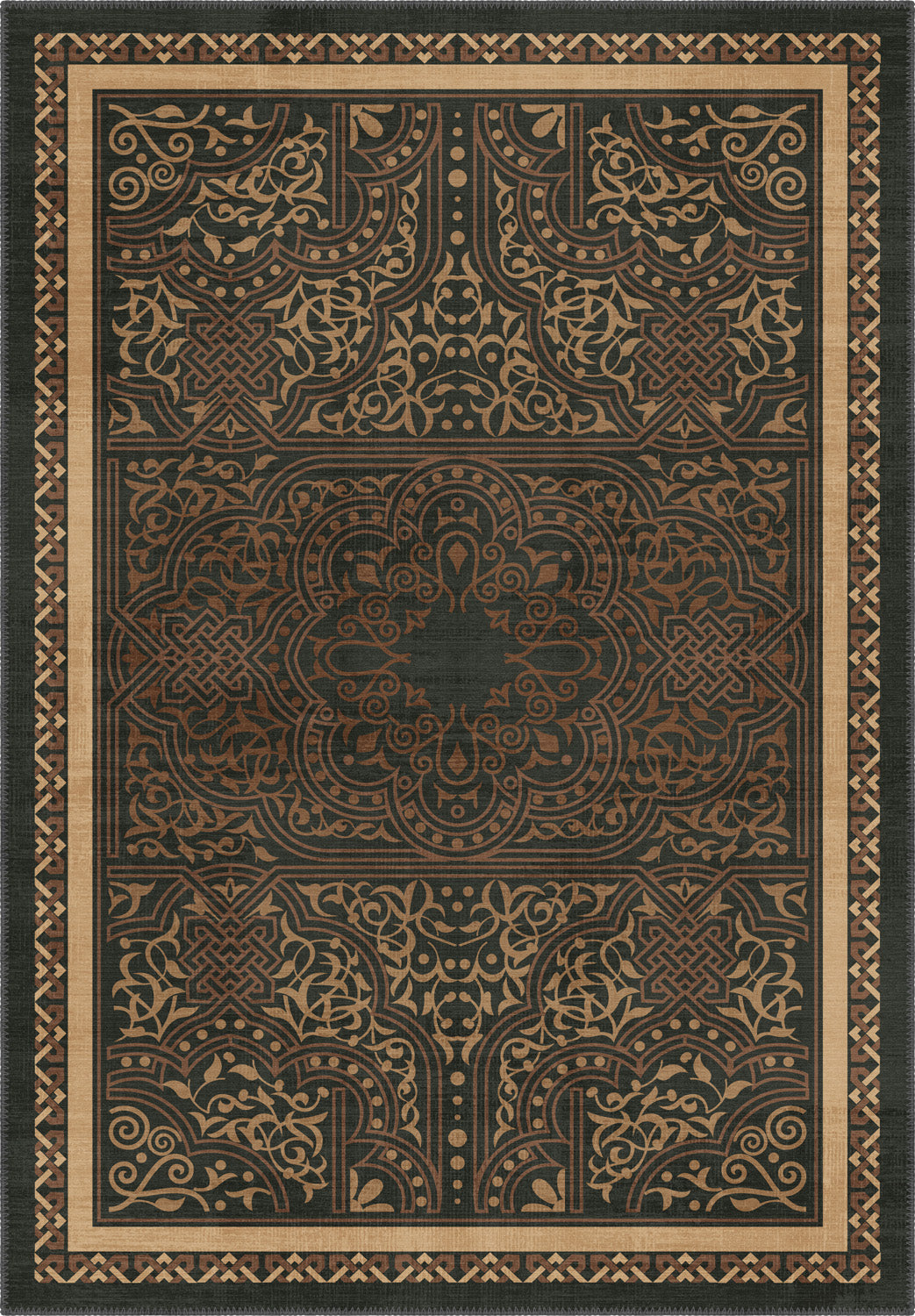 The Ronan Earthy Ornamental Rug is a masterclass in quiet power. Rooted in centuries of Celtic artistry, this piece layers interlocking knotwork, botanical curves, and mystical symmetry across a backdrop of rich charcoal and deep amber tones. The design evokes old libraries, stone chapels, and hand-illuminated manuscripts—all reimagined in a washable, modern form that feels timeless and grounded.