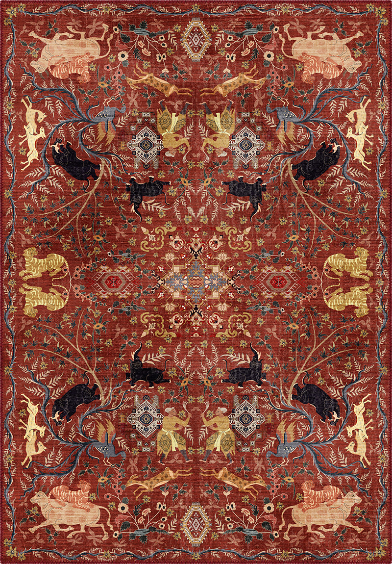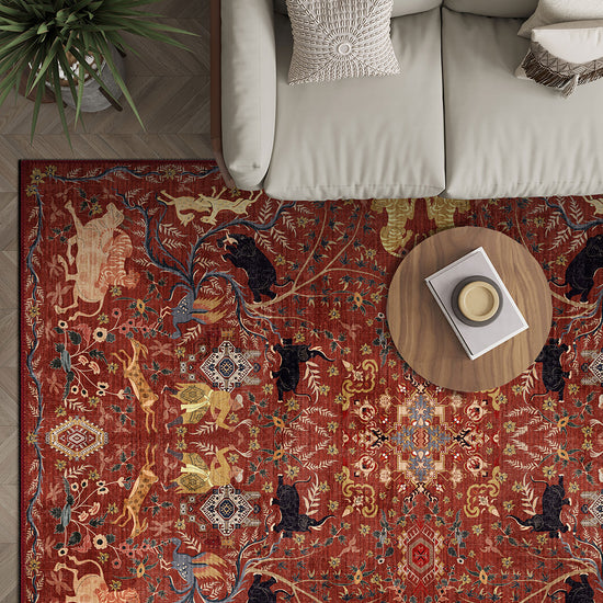 There are rugs… and then there are stories woven into every inch. The Rostam Persian Hunting Scene Rug is exactly that – a magnificent celebration of ancient artistry, courage and royal spectacle. Inspired by traditional Persian hunting scene rugs, this design captures the drama of galloping horses, prowling tigers and graceful deer, all set against a rich crimson backdrop that feels utterly majestic.