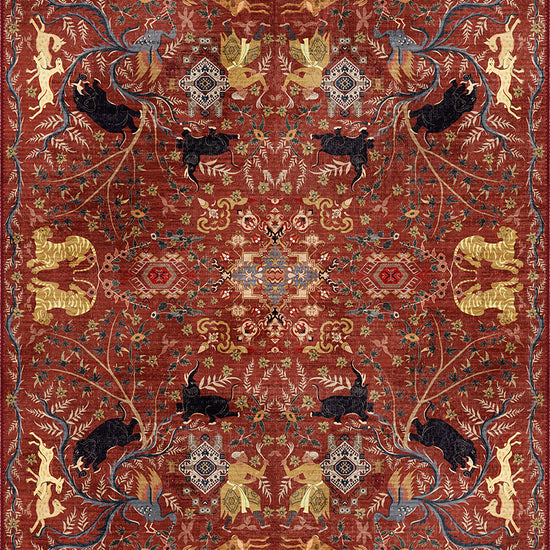 The intricate animal motifs and flourishing vines echo the grandeur of antique Persian rugs once found in royal courts. Every detail – from the leaping felines to the elegant riders – is symmetrically composed, creating a mesmerising balance that feels both powerful and poetic.