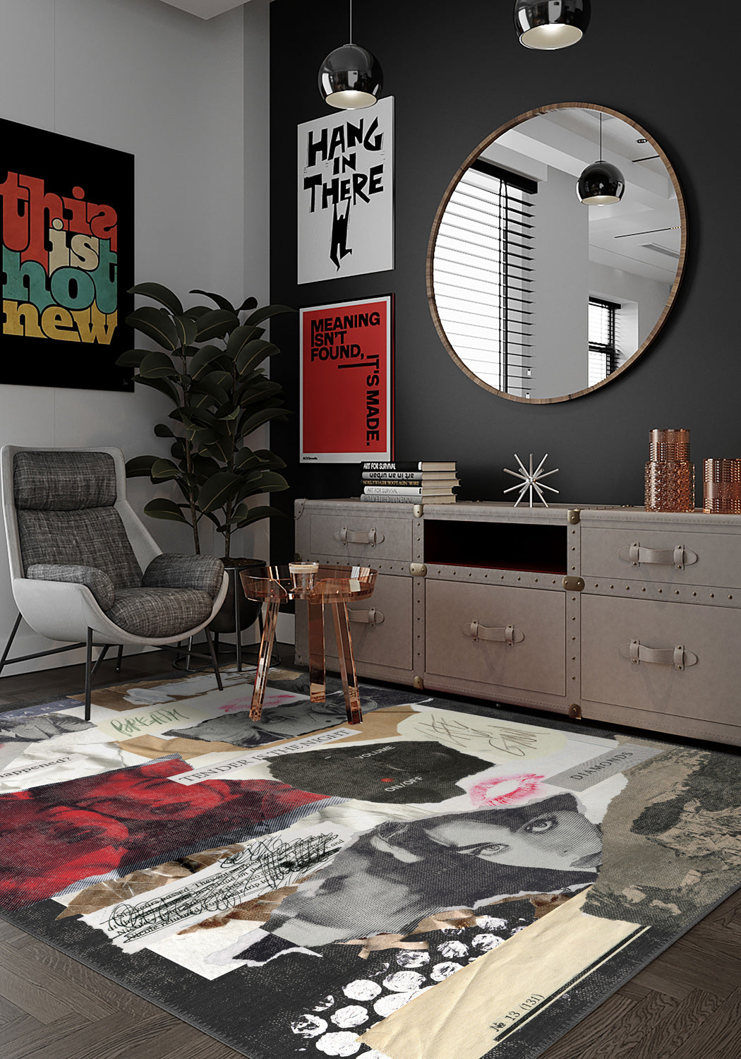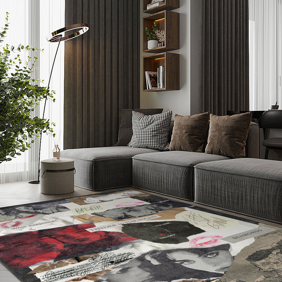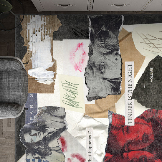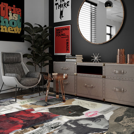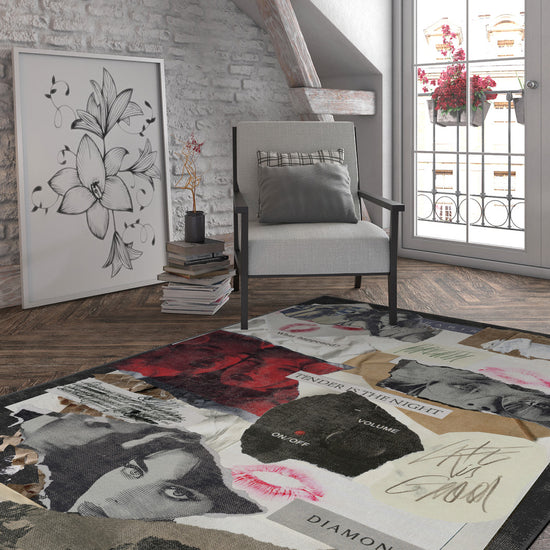 Inspired by the rebellious spirit of 20th-century collage art and surrealist design, this rug captures the spontaneity of torn paper, handwritten notes, and magazine cut-outs. Black-and-white photography meets splashes of red and bold typography, creating a layered narrative that feels both contemporary and nostalgic. It’s a piece that blurs the line between modern rug and wall-worthy artwork.