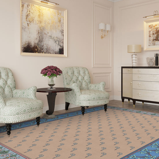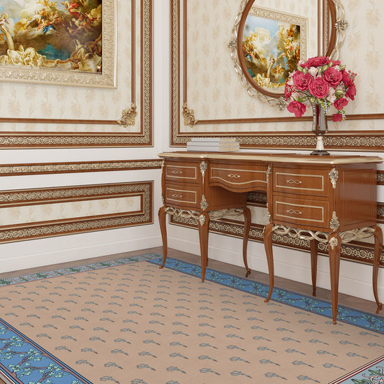 The Sanctuaire Romantic Gothic Rug feels like stepping into a forgotten chapel where soft light dances across painted stone and blooming vines. With its dusky rose base, tiny floral motifs, and ornate blue-green borders inspired by gothic arches and stained glass windows, this rug brings history, poetry, and a dash of drama into your space.