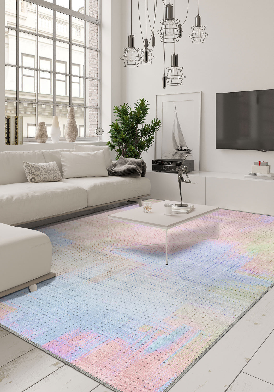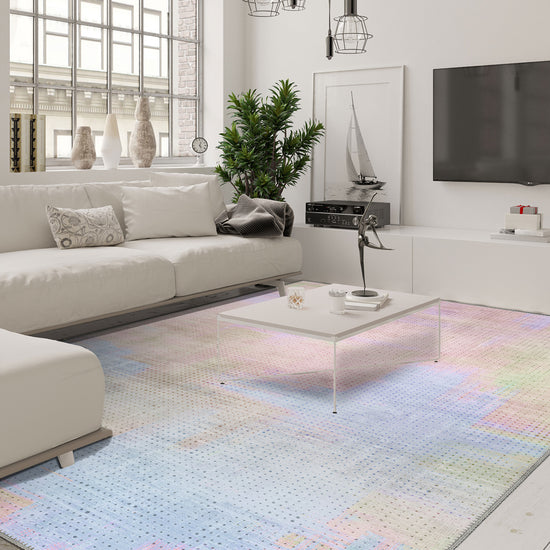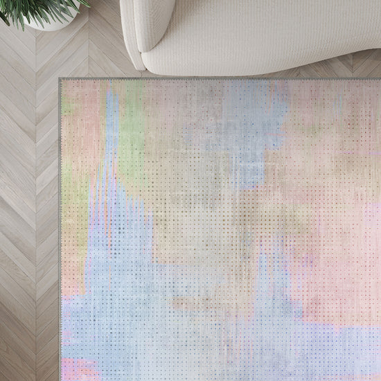 The Serene Abstract Pastel Rug is like a breath of soft spring air captured in textile form. Gentle strokes of blush, sky blue, lavender, and mint blend across a hazy, painterly surface with a pixelated texture that adds contemporary depth. This is not just a rug—it’s a serene moment, a light touch, a mood. Romantic yet modern, soft yet artful, it brings tranquillity to even the busiest of homes.