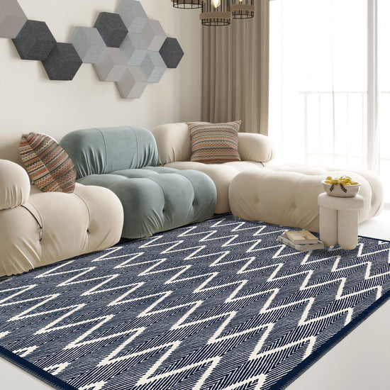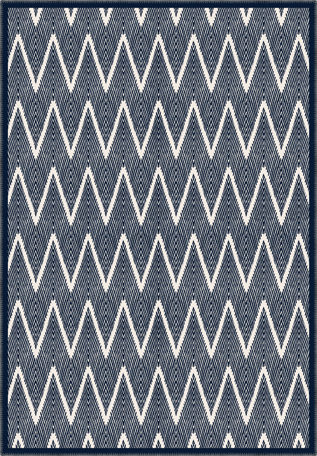 - Rich Navy Palette: The deep navy tones contrast beautifully with the crisp white chevron, giving the rug a modern and sophisticated appearance.