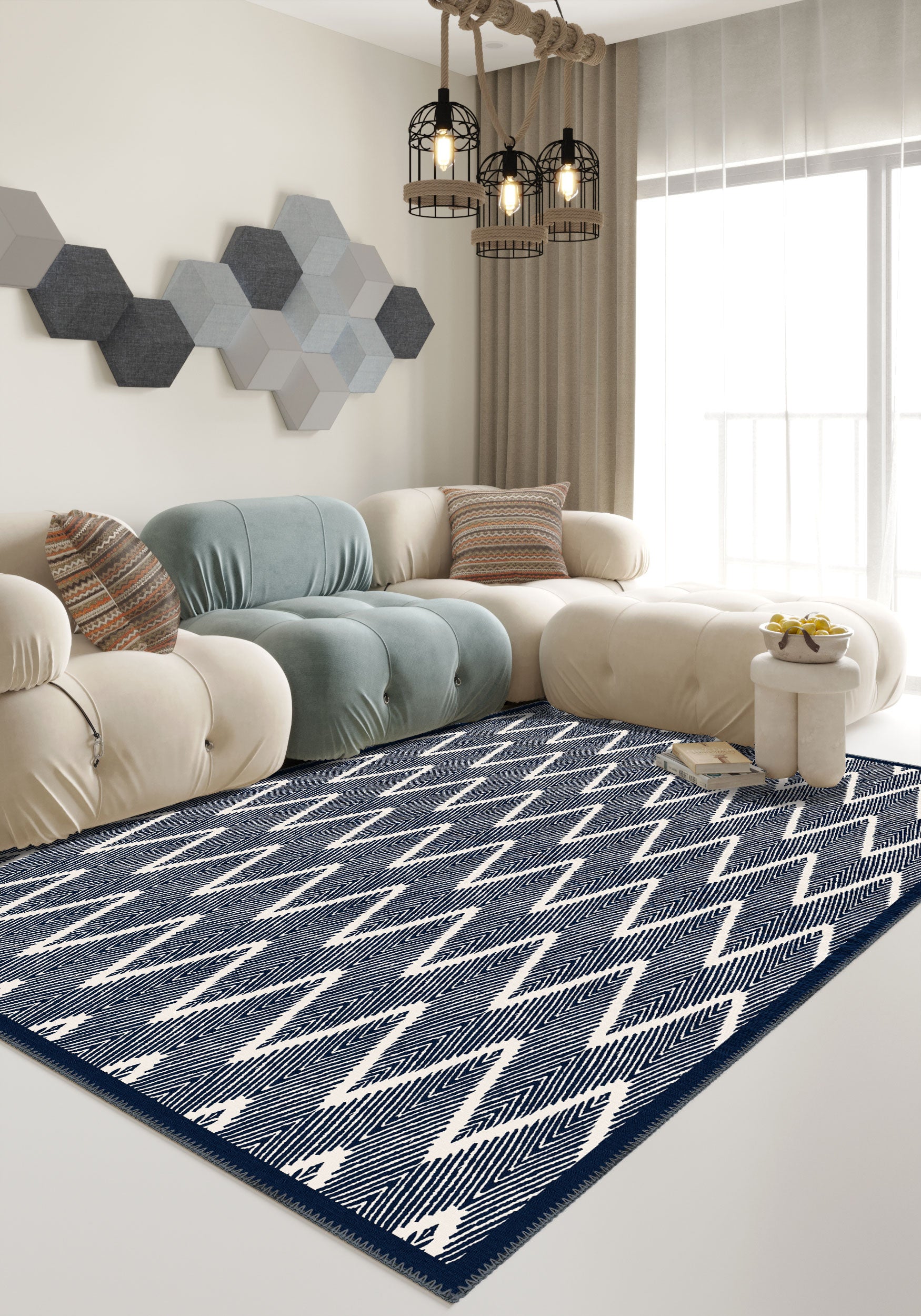 - Urban & Industrial: Its geometric design and bold navy tones add texture and interest to industrial-style spaces, providing a balance of warmth and structure.