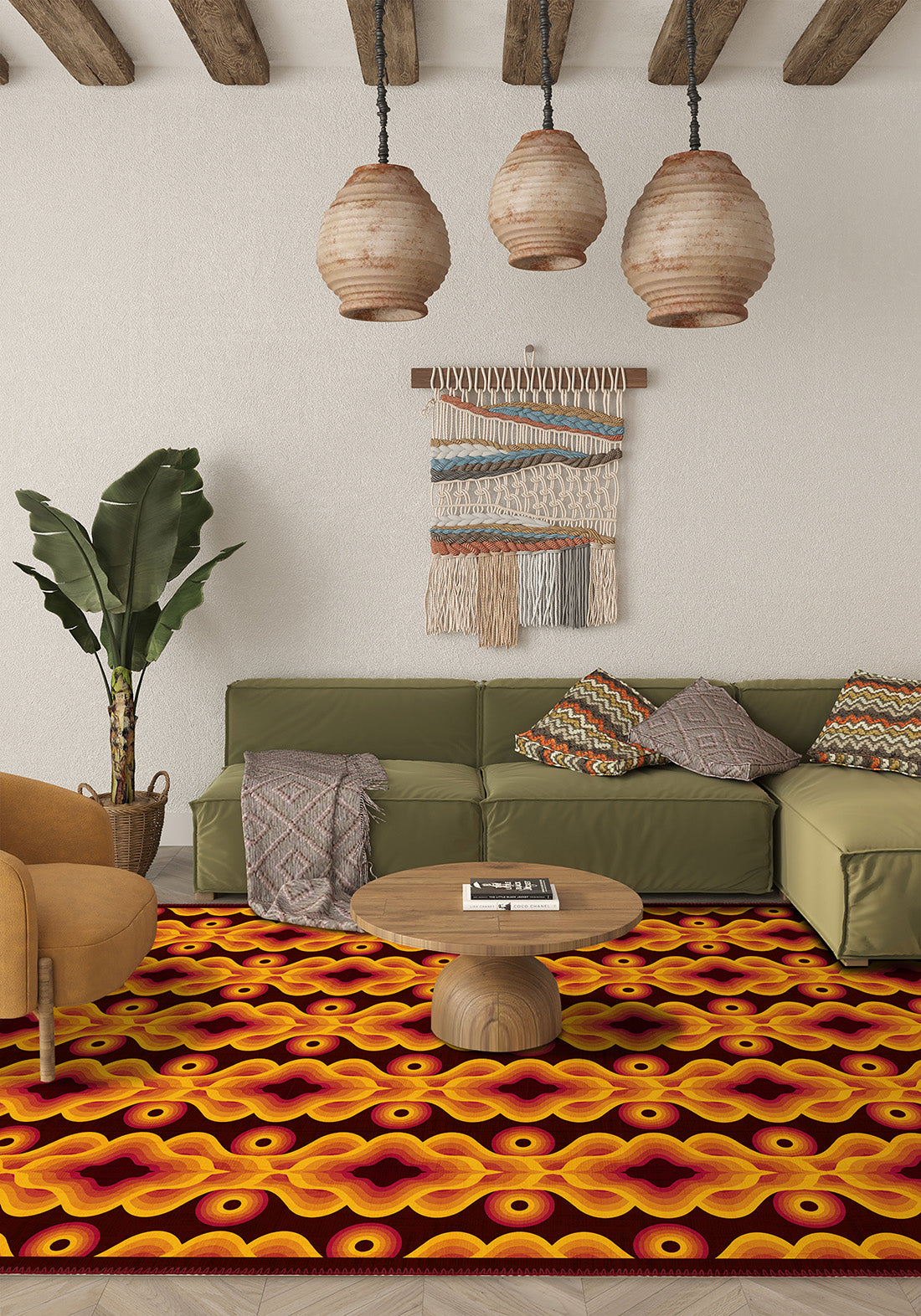- Striking orange rug tones paired with deep reds and soft yellows